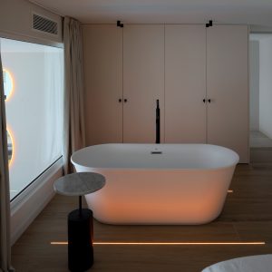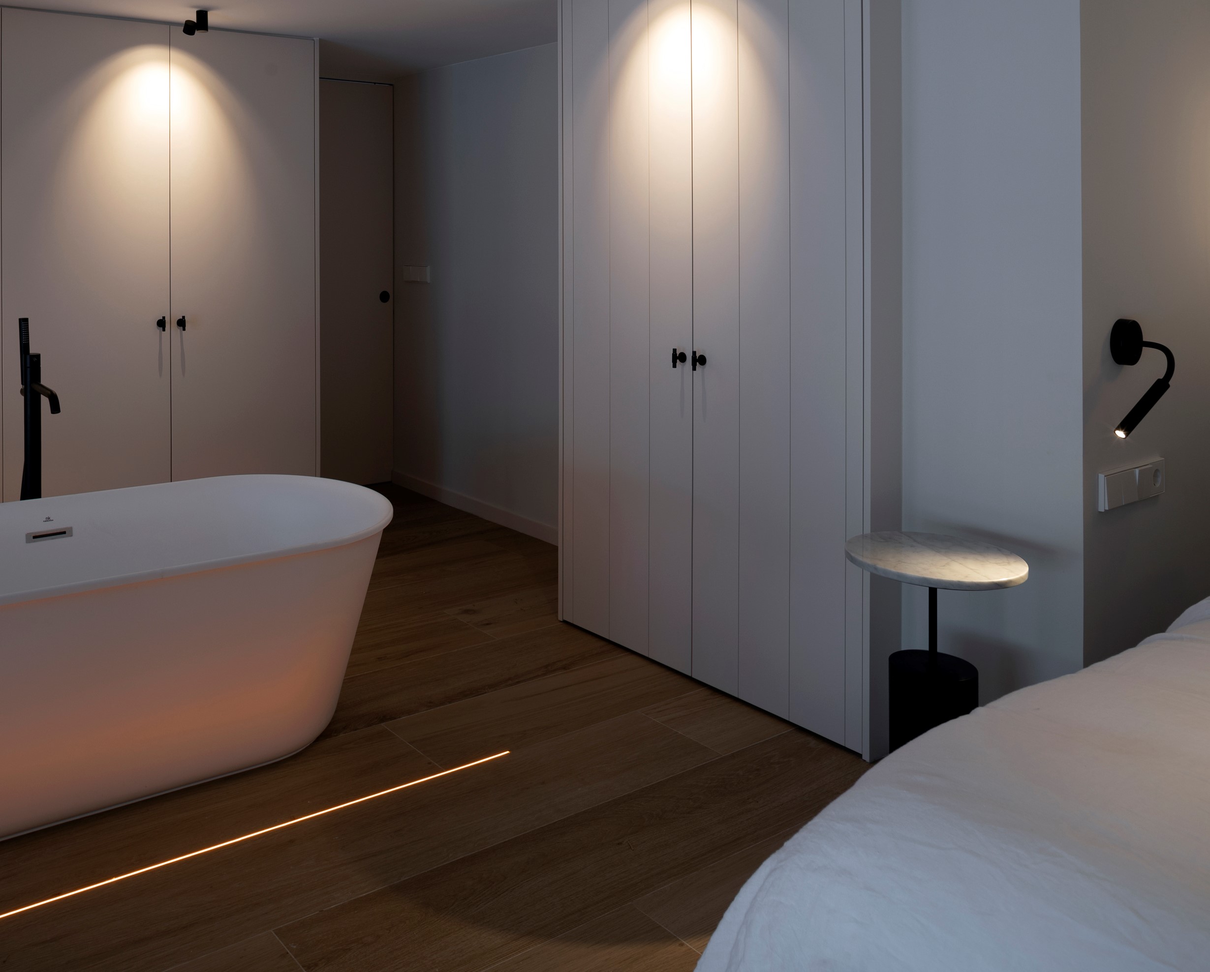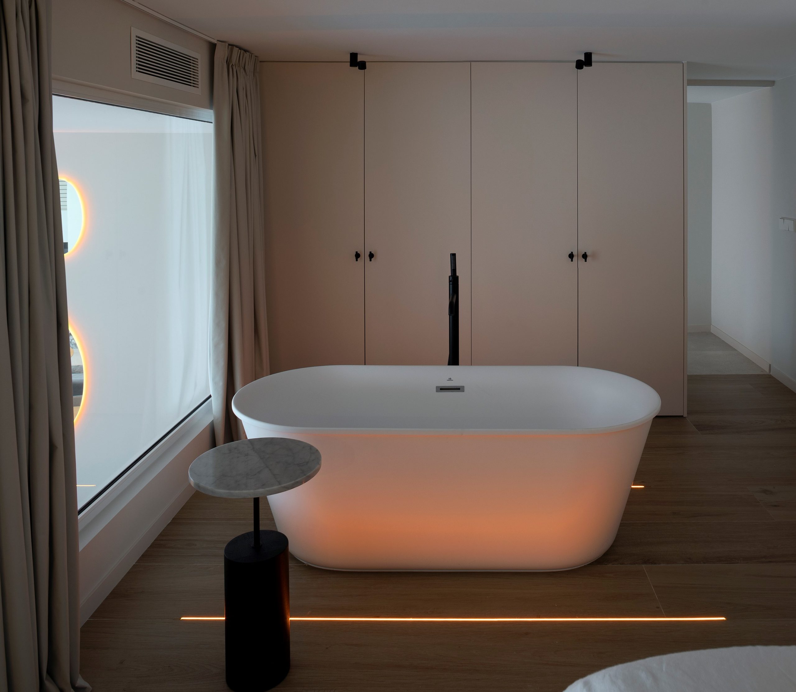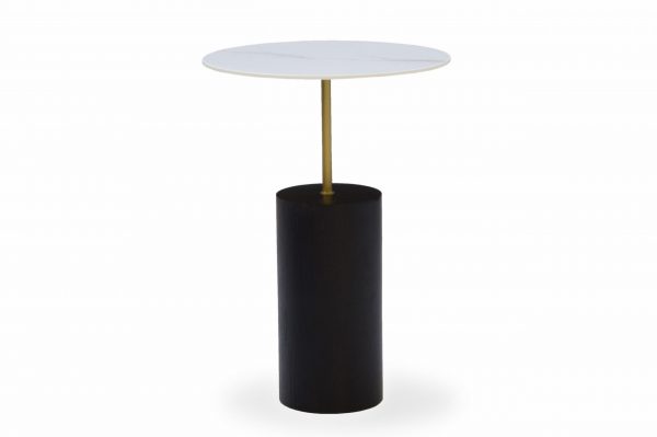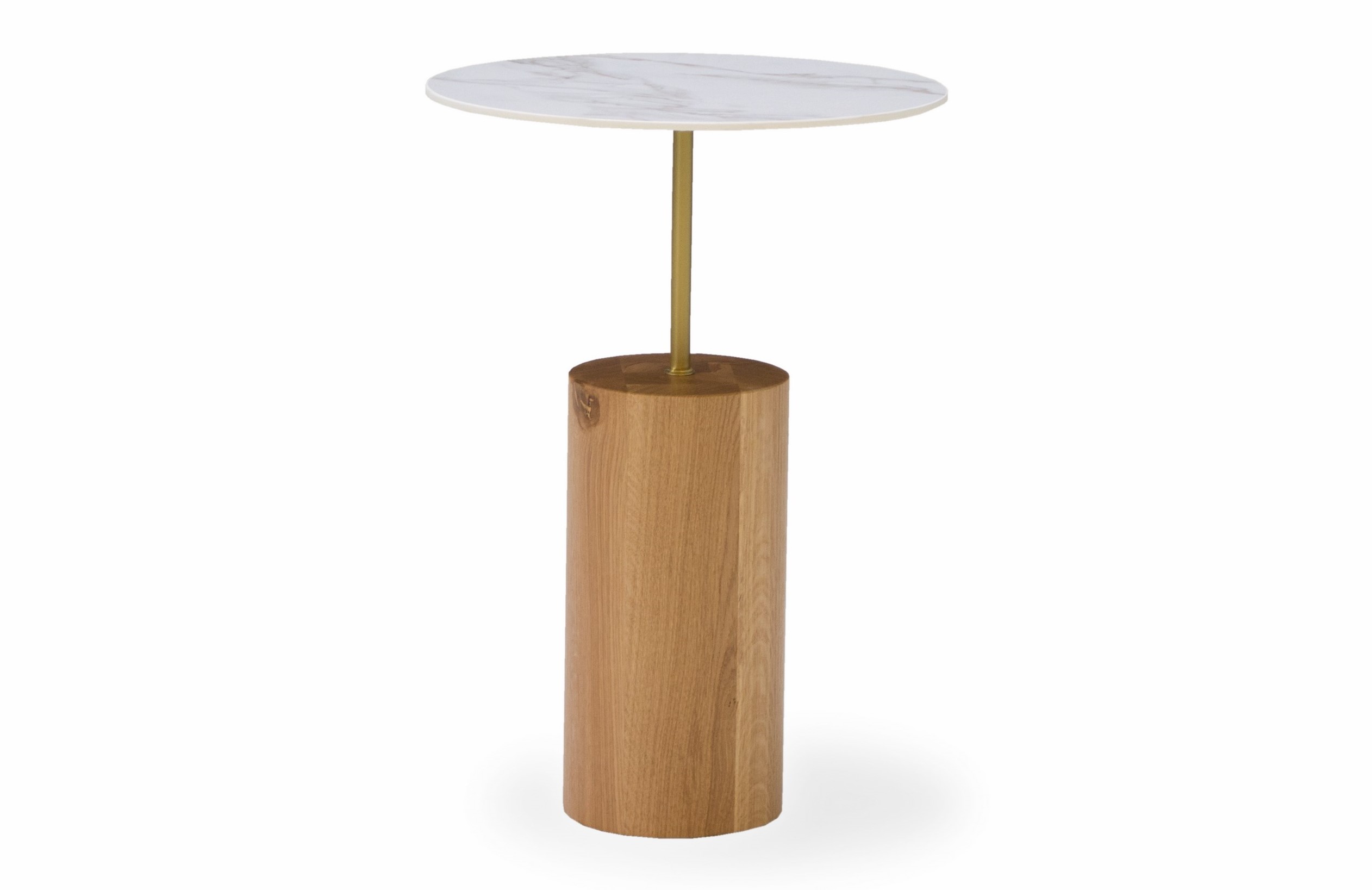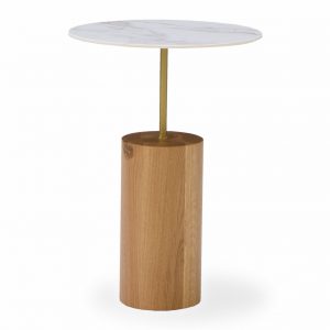 Mesa auxiliar Linna. La mesa auxiliar Linna es una mesa compuesta de una base de madera maciza de roble y una estructura de metal que sujeta una pequeño tablero de porcelánico. Su presencia es ligera en el espacio a la vez que otorga personalidad y carácter.