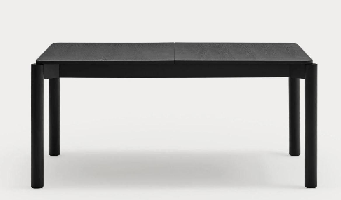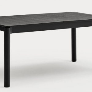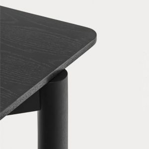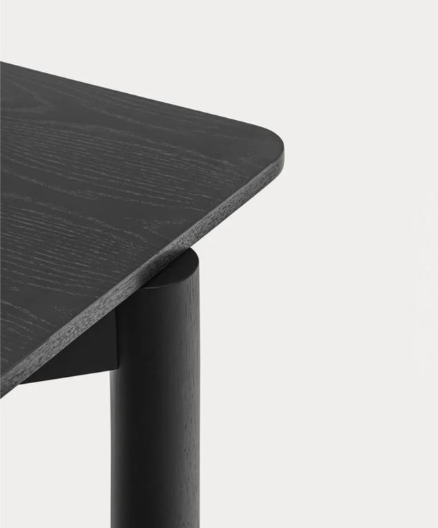 Las patas están realizadas en madera maciza y el sobre está chapado en fresno natural o tintado en negro.