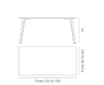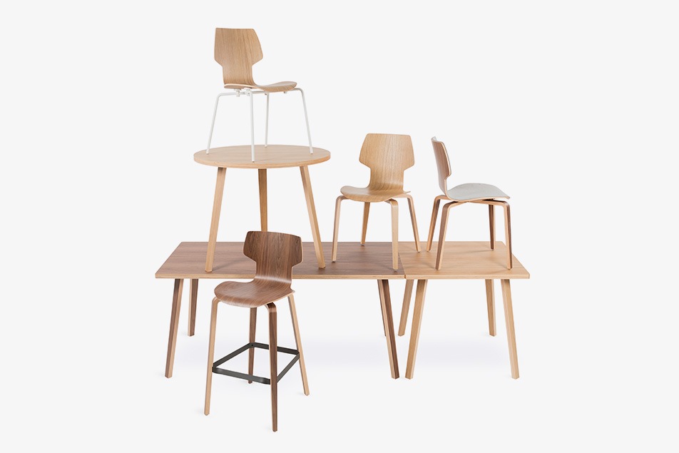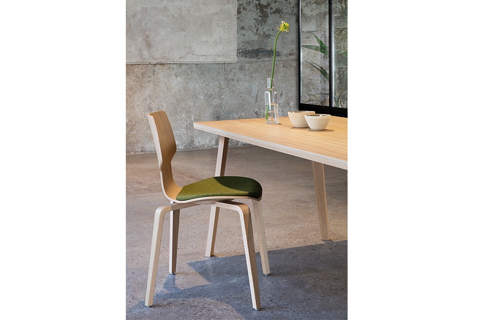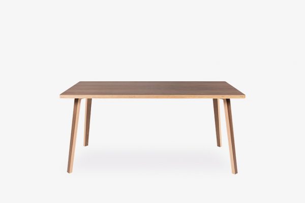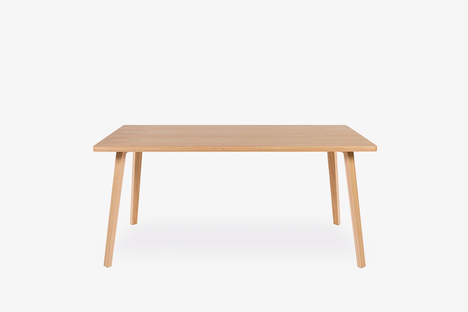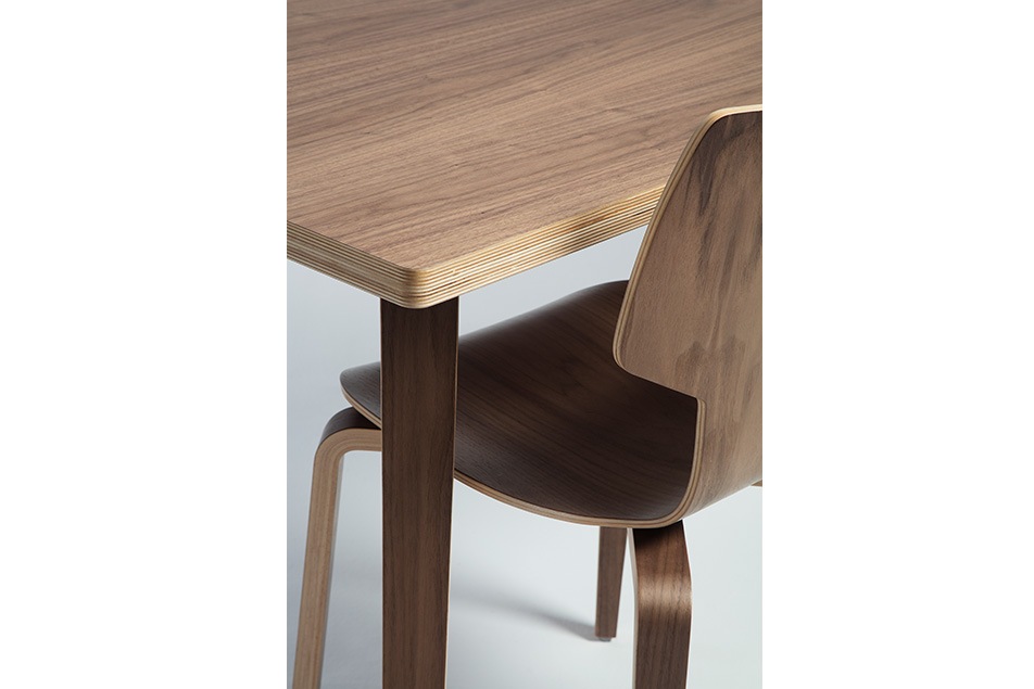 La disposición discreta de las patas curvas hacen que la mesa sea visualmente ligera. Un diseño que propone una mesa sin estructura, con un sobre que no esconde la naturaleza constructiva del contrachapado.