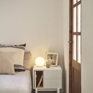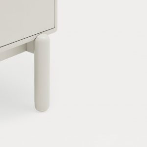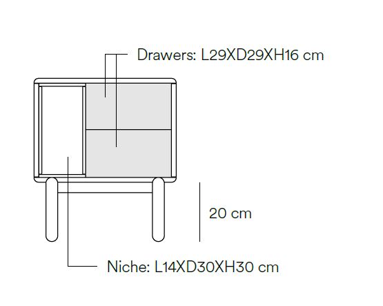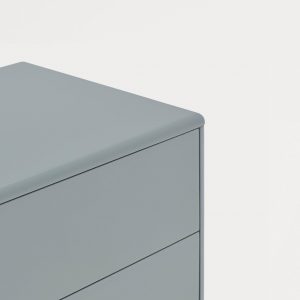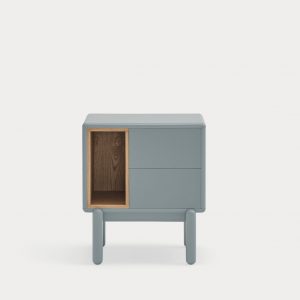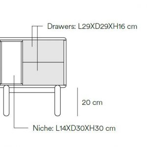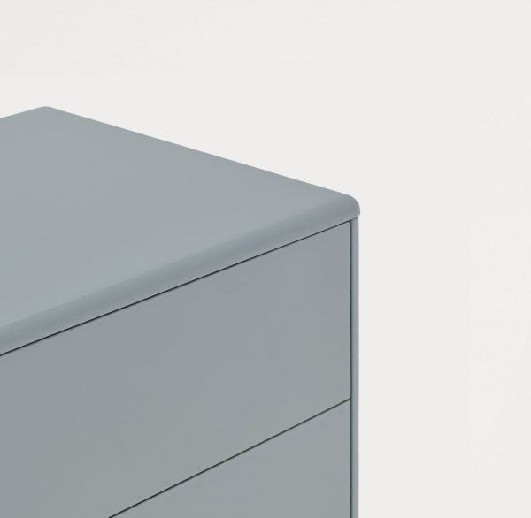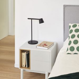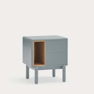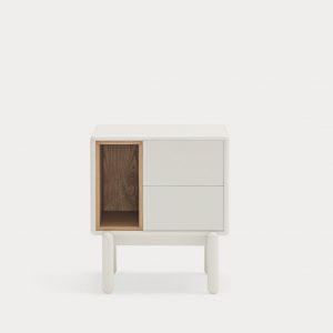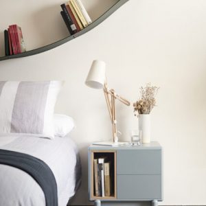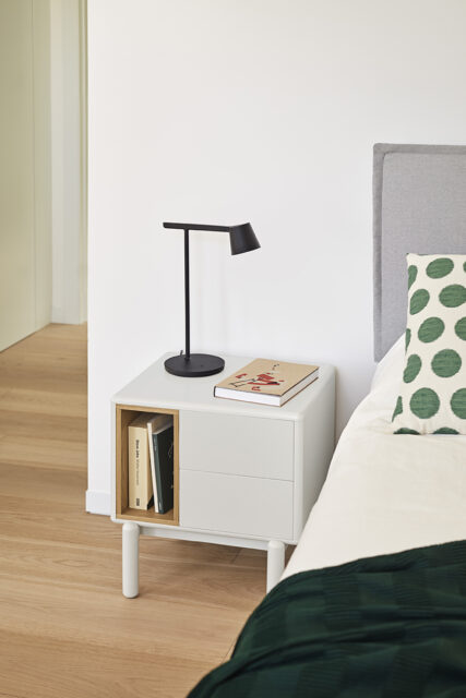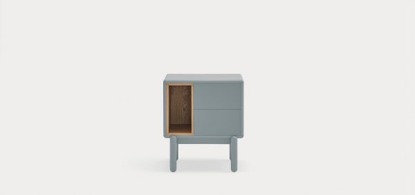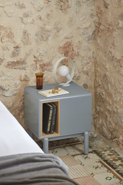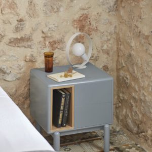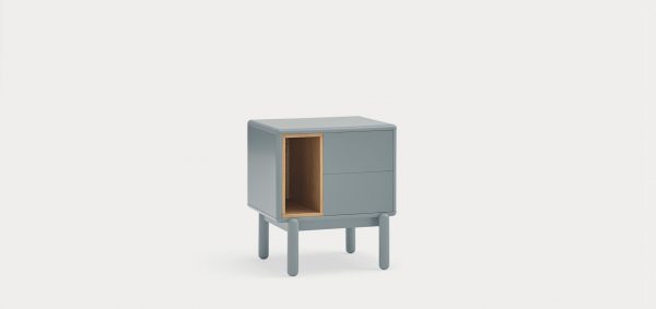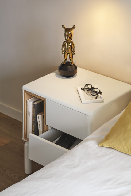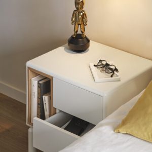 Mesita de noche Corvo. La mesita de noche Corvo tiene una silueta redondeada, de líneas suaves y de aspecto voluminoso. El ensamblaje de sus piezas quedan integradas mostrando un aspecto muy limpio y cuidado. Se encuentra disponible en color crema y gris perla, con un nicho forrado en chapa de roble perfecto para guardar libros. Ademas dispone de dos cajones para un almacenaje extra. Un diseño perfecto para guardar los objetos que usamos cotidianamente en el dormitorio (libros, gafas, antifaz…etc).