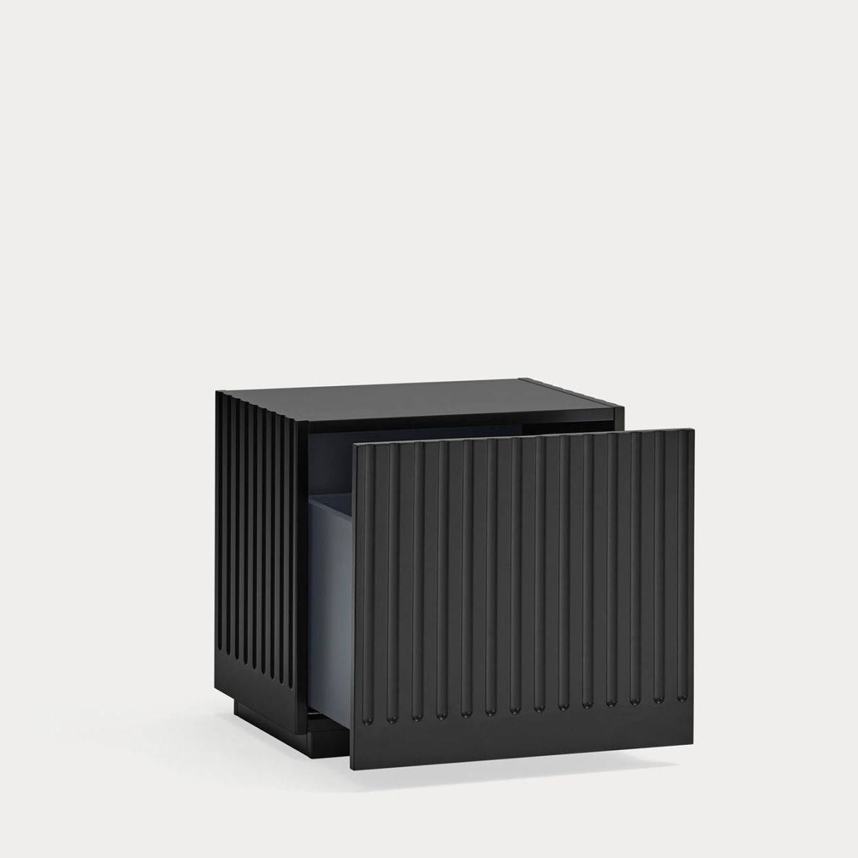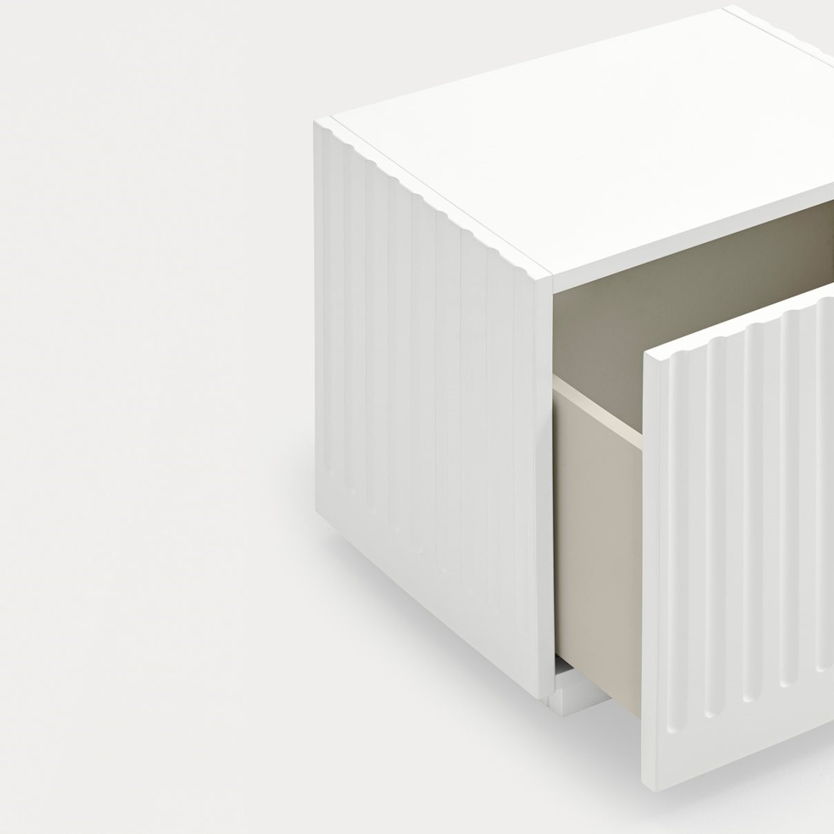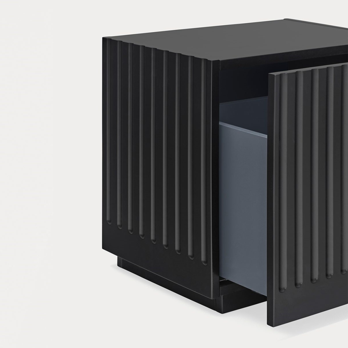 Mesita de noche Doric. La mesita de noche Doric es robusta, contundente y con unas líneas que nos recuerdan a la arquitectura de la Grecia clásica. Los surcos verticales y su gran presencia nos recuerda como estos clásicos buscaban la belleza y la proporcionalidad en sus obras. Es una mesita de noche práctica dado su cajón de grandes dimensiones para almacenar de forma eficaz.