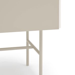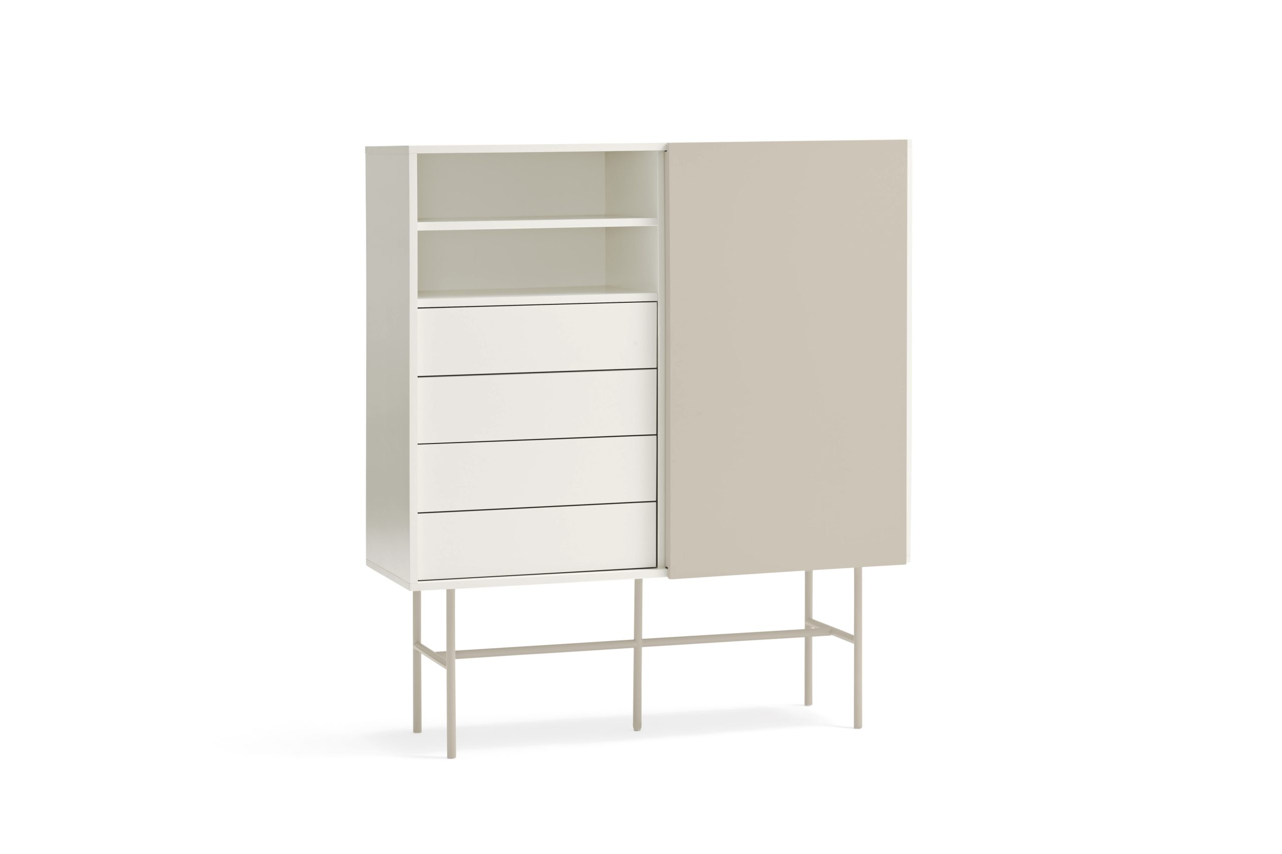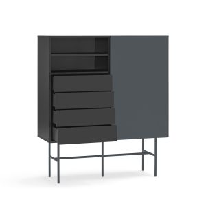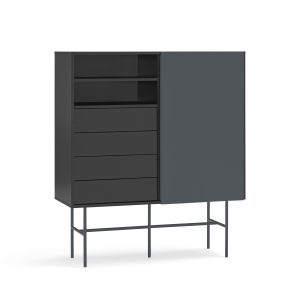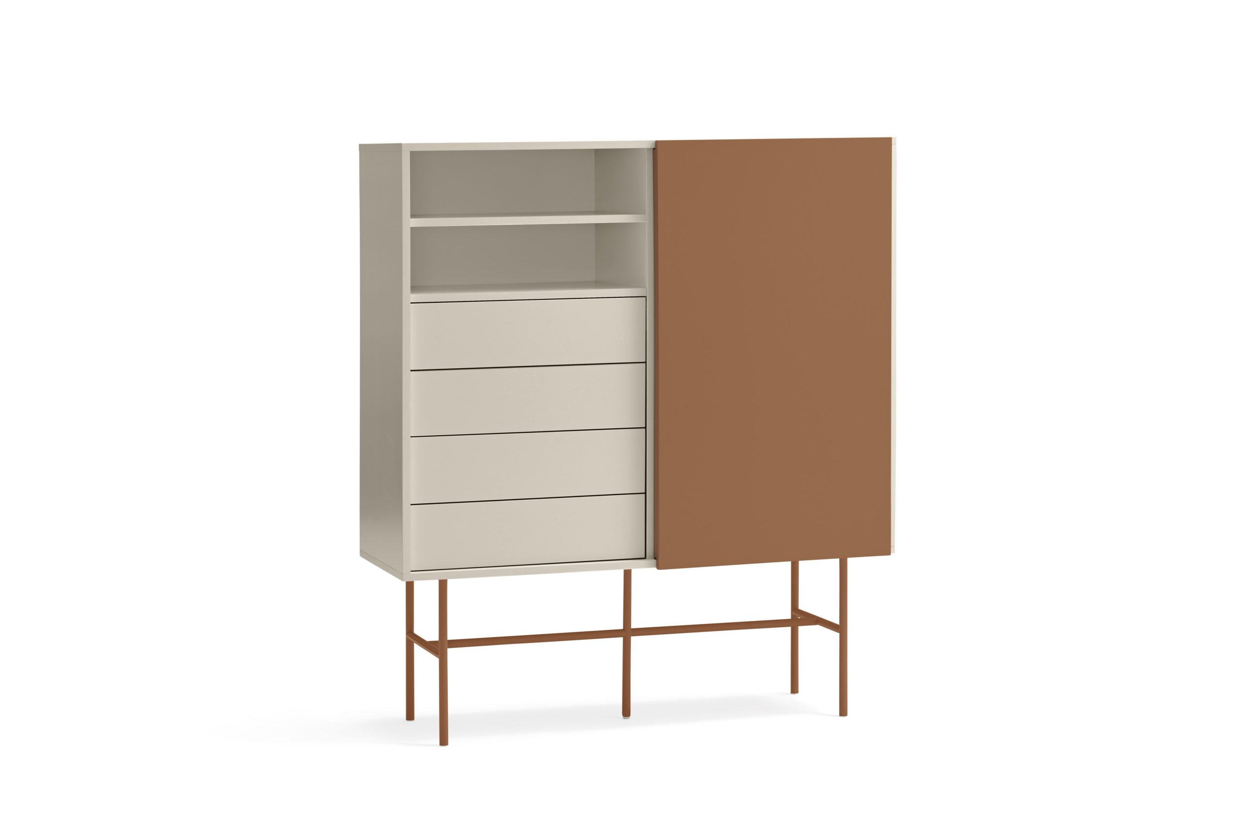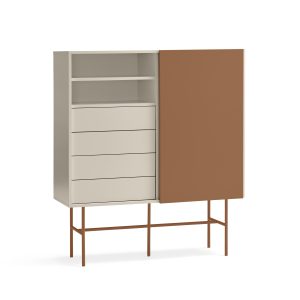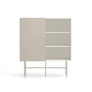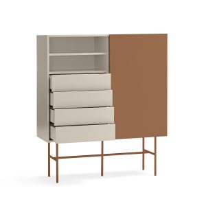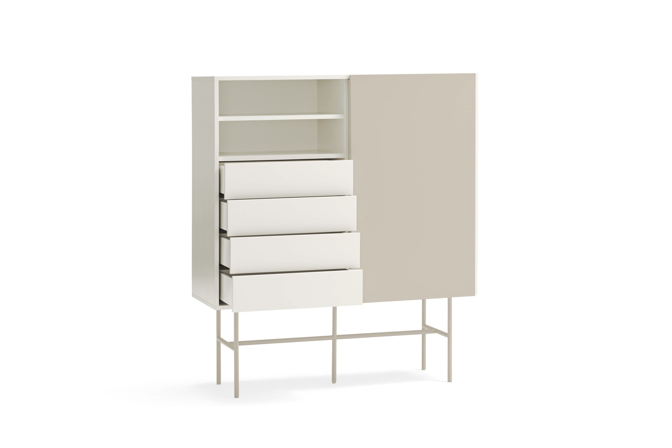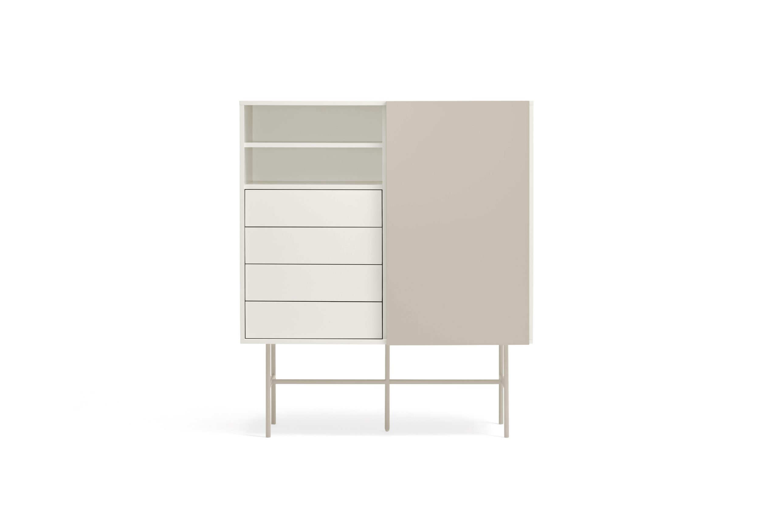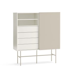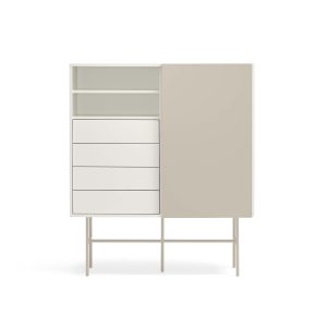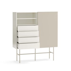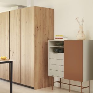 Mueble cómoda Nube. El Mueble auxiliar Nube forma parte de una nueva colección de Teulat. Una colección versátil y de tendencia con una combinación de colores adaptable a diferentes estilos. La colección Nube destaca por su configuración única y distintiva gracias a su puerta corredera, la cual permite ser colocada libremente según las preferencias de cada uno. La forma en la que esta puerta desliza sobre el auxiliar Nube, revelando y ocultando las distintas secciones de su interior, está inspirada en cómo las nubes se desplazan en el cielo. Una cómoda de dimensiones perfectas para adaptarse a cualquier espacio y necesidades ya que dispone de 4 cajones, 2 baldas y una puerta corredera que oculta 3 nichos.