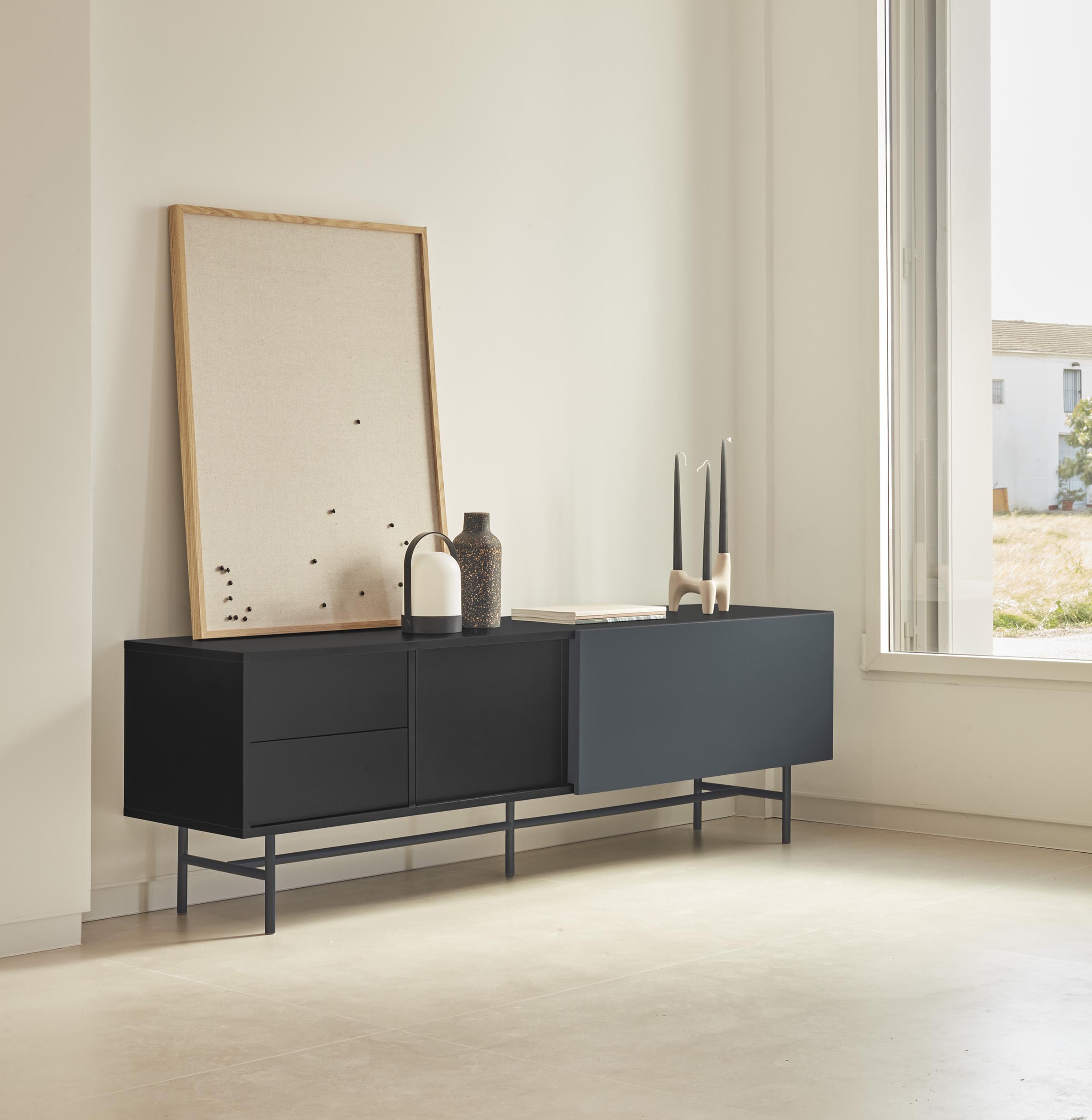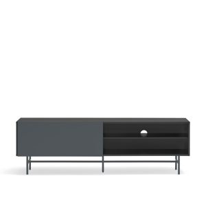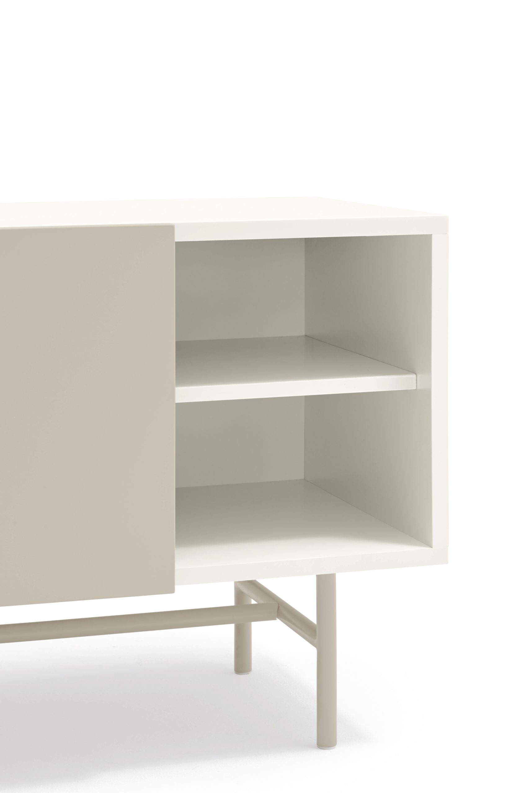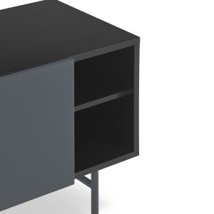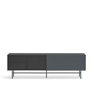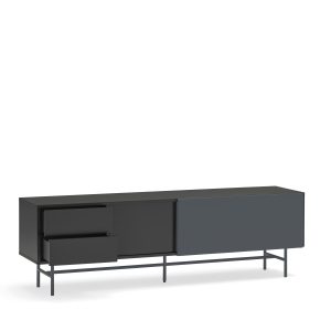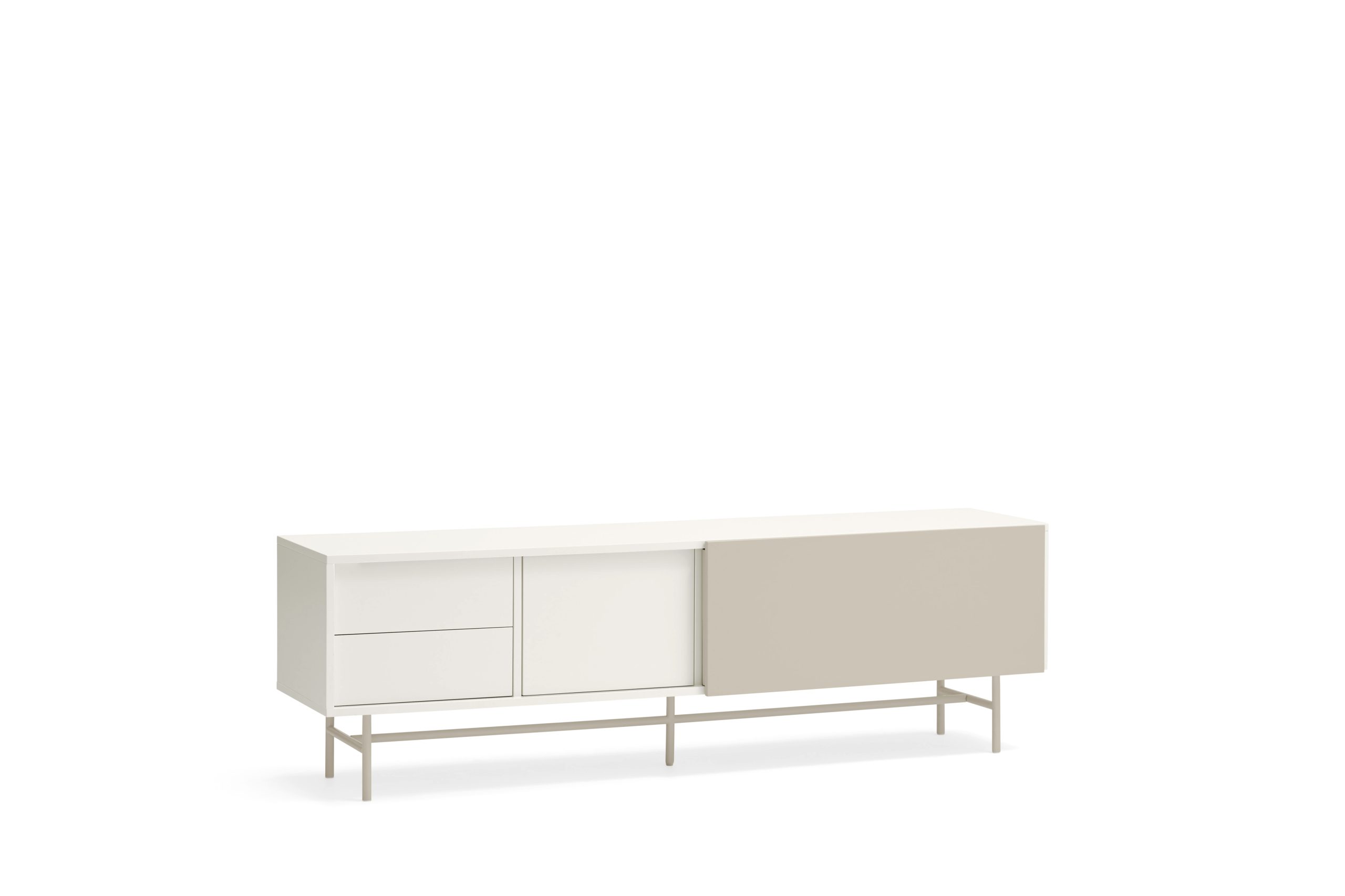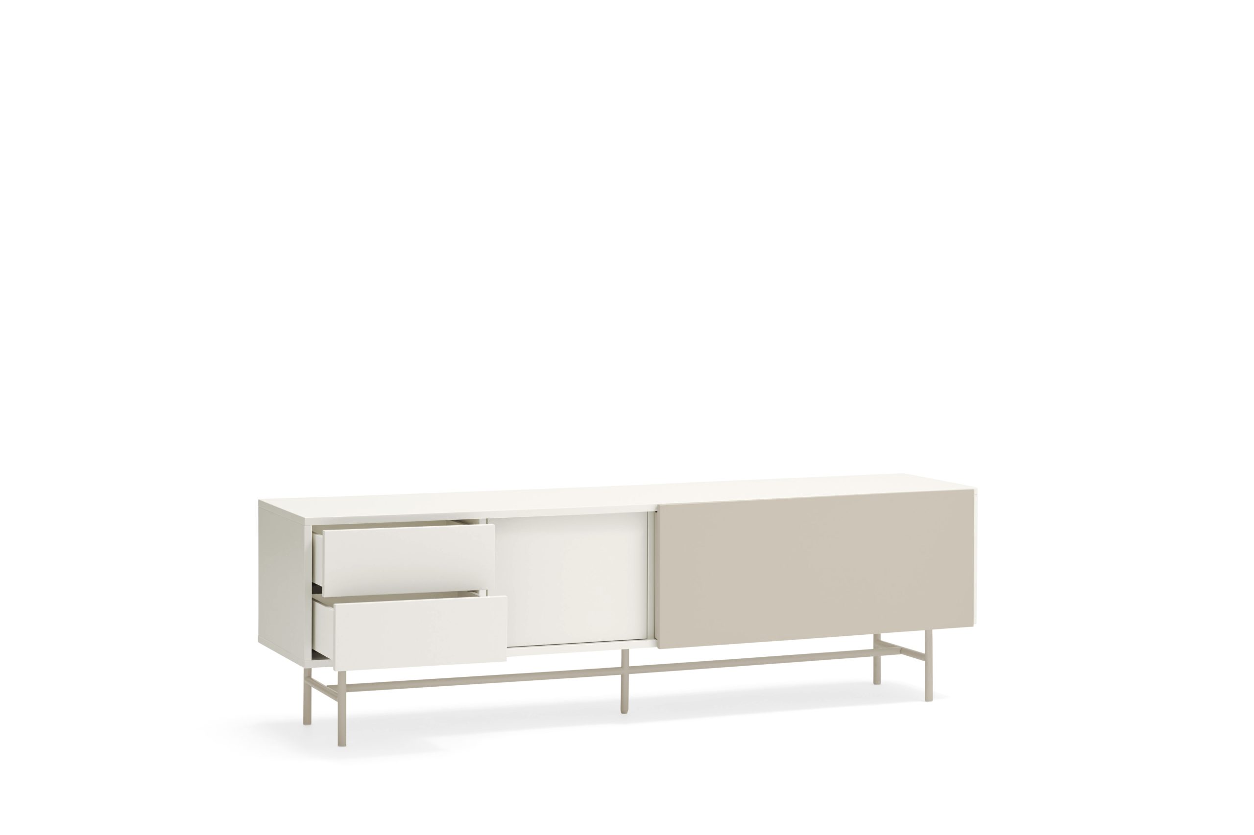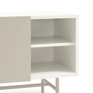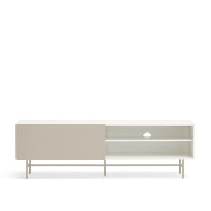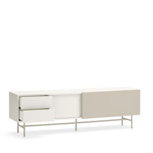 Mueble de TV Nube. El mueble de TV Nube forma parte de una nueva colección de Teulat. Una colección versátil y de tendencia con una combinación de colores adaptable a diferentes estilos. La colección Nube destaca por su configuración única y distintiva gracias a su puerta corredera, la cual permite ser colocada libremente según las preferencias de cada uno. La forma en la que esta puerta desliza sobre el auxiliar Nube, revelando y ocultando las distintas secciones de su interior, está inspirada en cómo las nubes se desplazan en el cielo. Un mueble de TV de dimensiones perfectas para adaptarse a cualquier espacio y necesidades ya que dispone de 2 cajones, una puerta y una puerta corredera que oculta 2 nichos perfectos para ocultar aparatos. Además dispone de un pasacables en su parte posterior.
