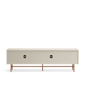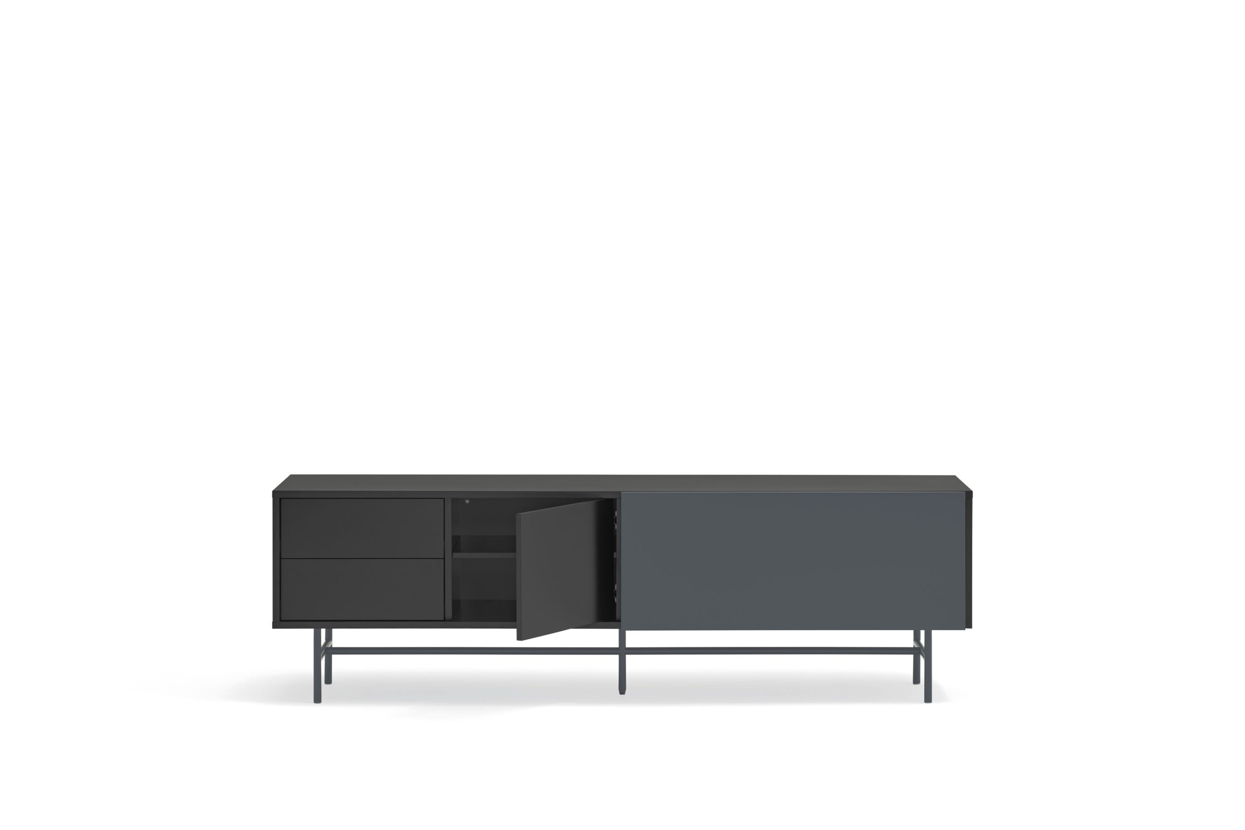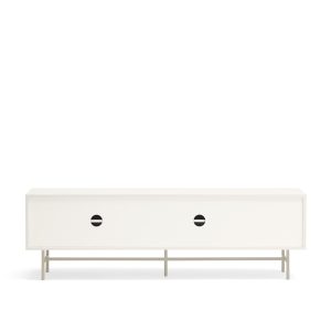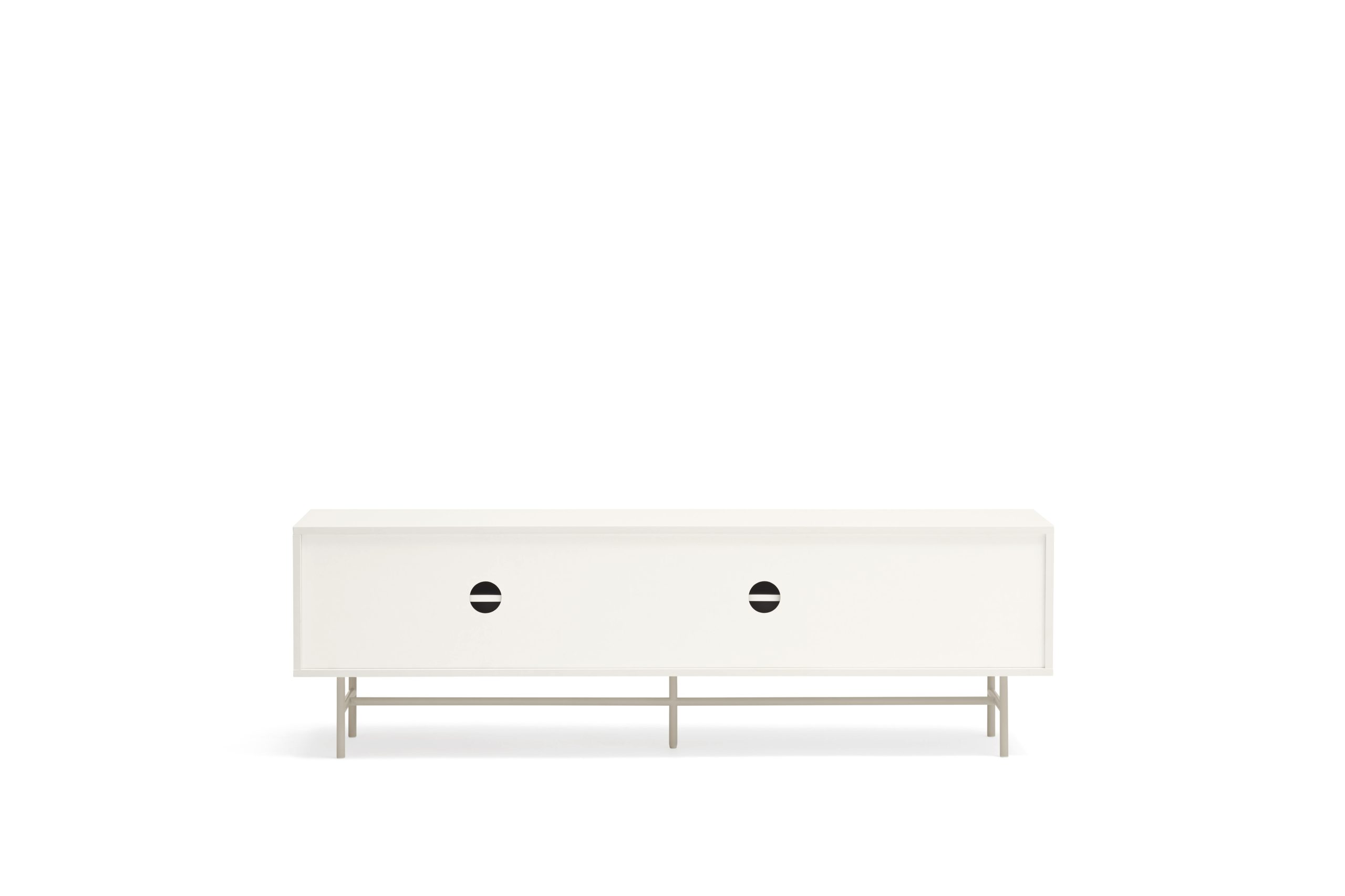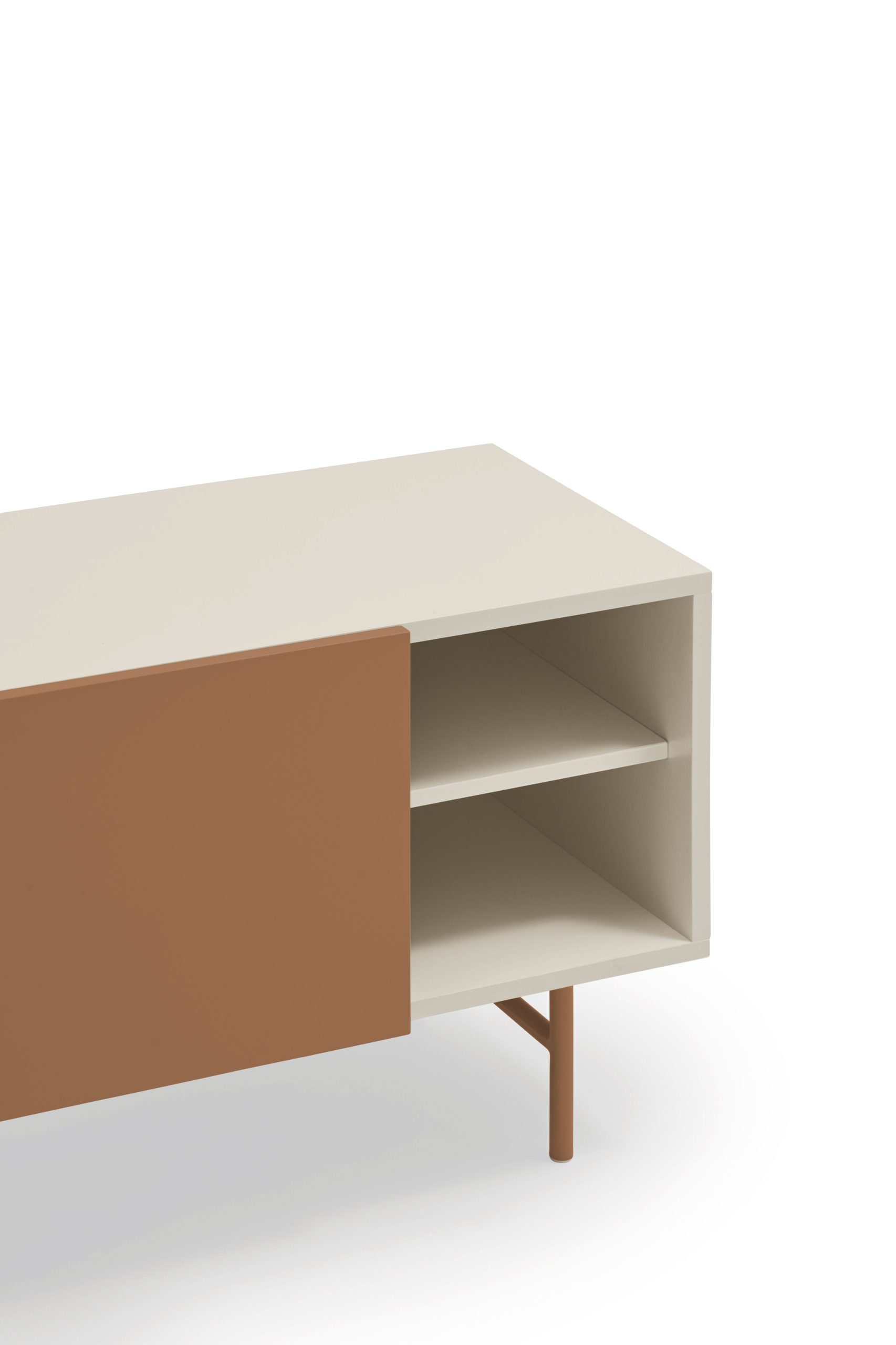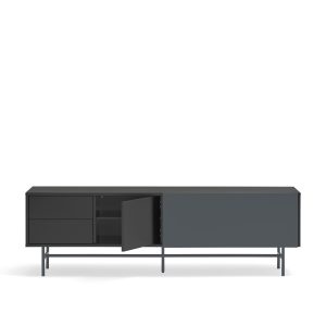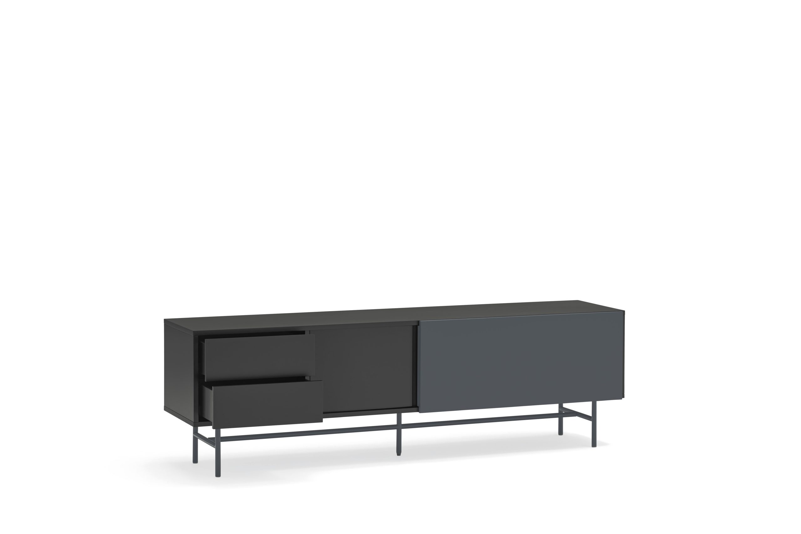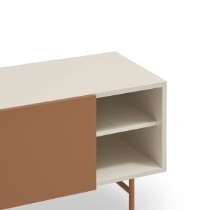 Mueble de TV Nube. El mueble de TV Nube forma parte de una nueva colección de Teulat. Una colección versátil y de tendencia con una combinación de colores adaptable a diferentes estilos. La colección Nube destaca por su configuración única y distintiva gracias a su puerta corredera, la cual permite ser colocada libremente según las preferencias de cada uno. La forma en la que esta puerta desliza sobre el auxiliar Nube, revelando y ocultando las distintas secciones de su interior, está inspirada en cómo las nubes se desplazan en el cielo. Un mueble de TV de dimensiones perfectas para adaptarse a cualquier espacio y necesidades ya que dispone de 2 cajones, una puerta y una puerta corredera que oculta 2 nichos perfectos para ocultar aparatos. Además dispone de un pasacables en su parte posterior.