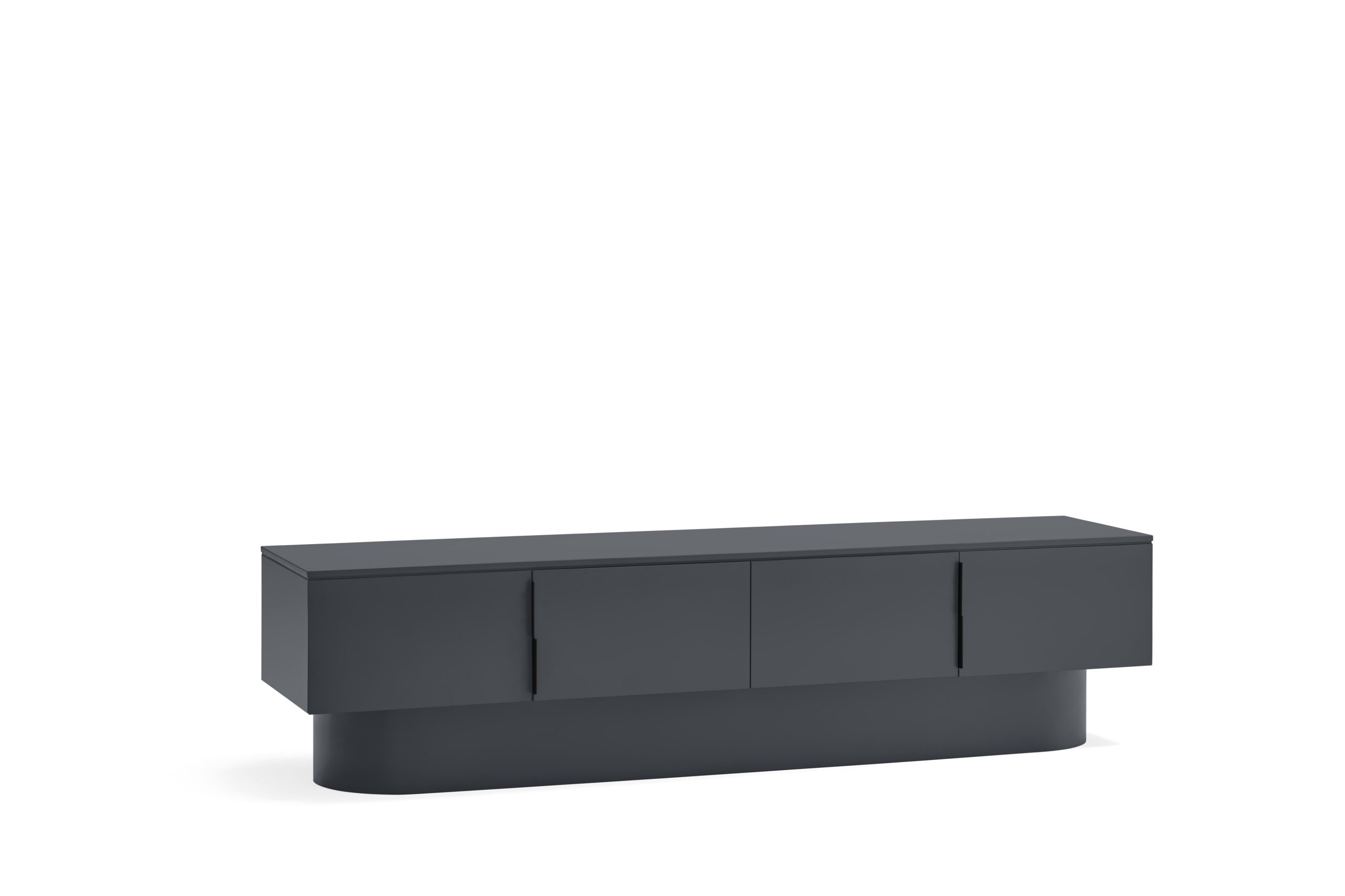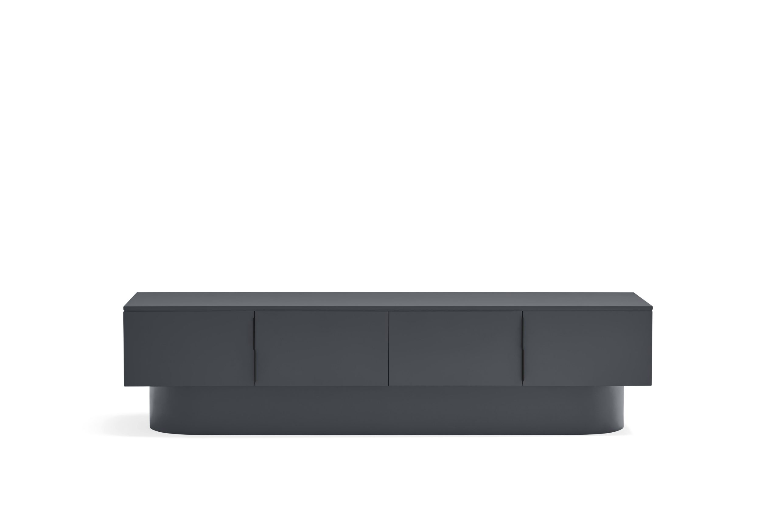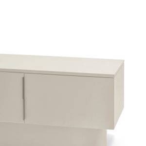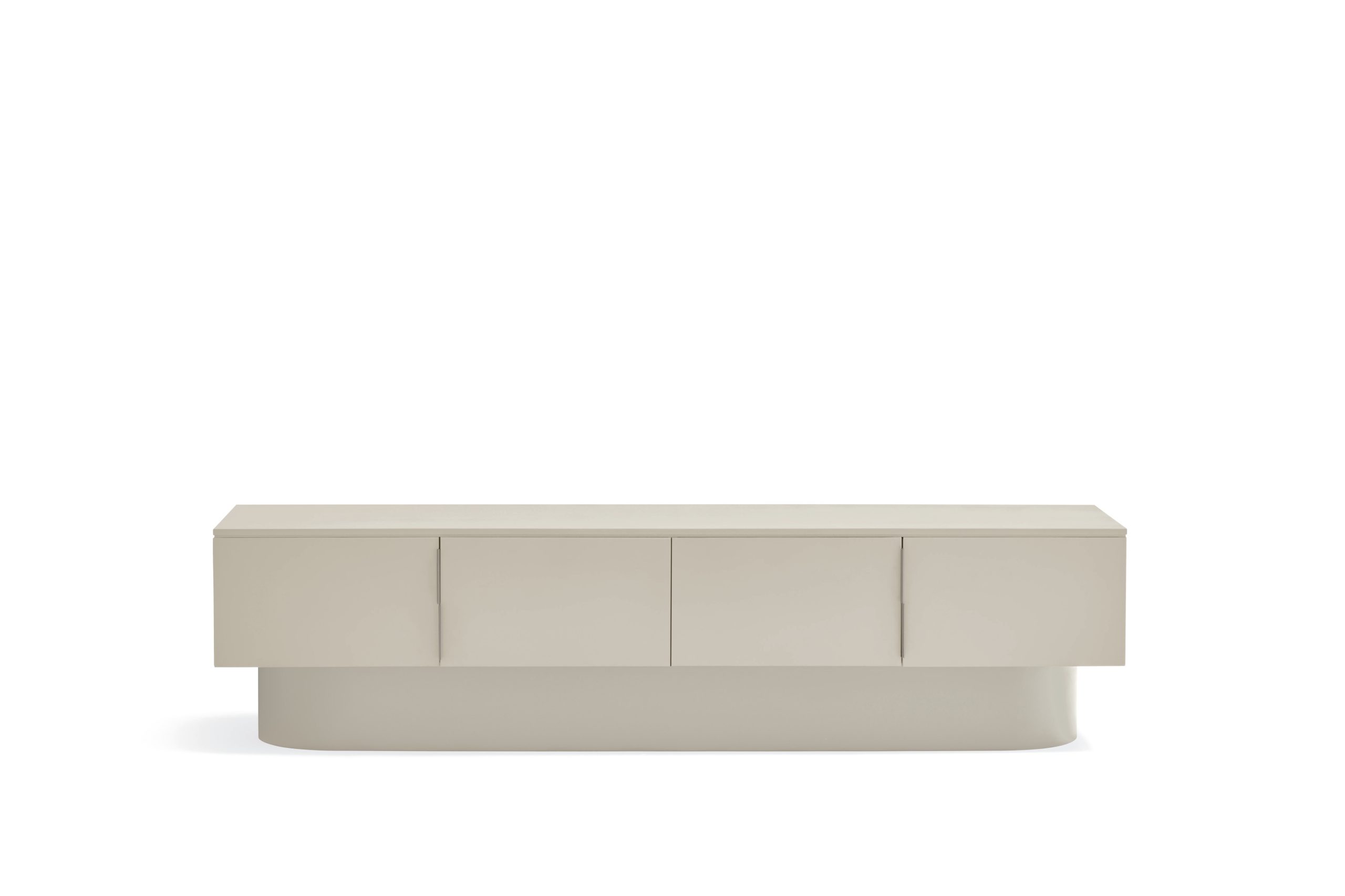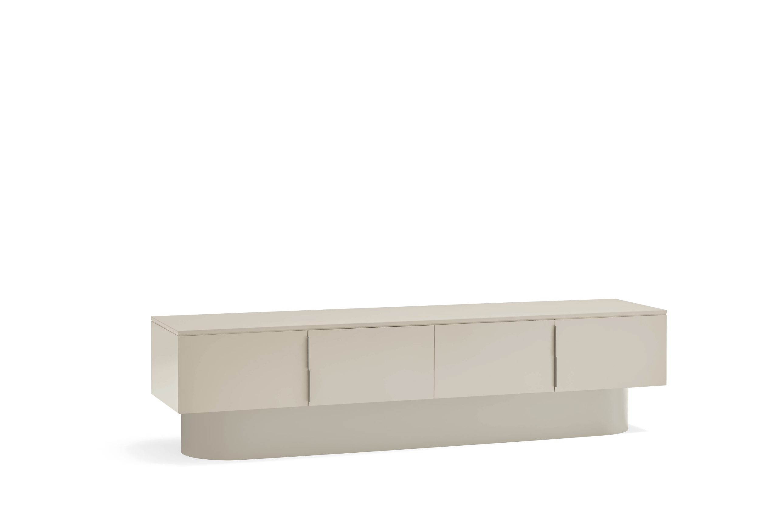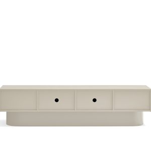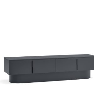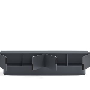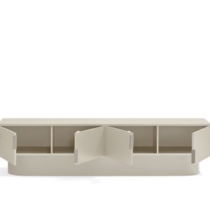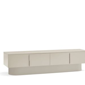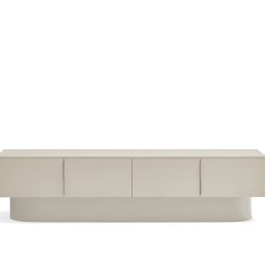 Mueble TV Tótem. Con su aspecto casi monolítico, Tótem nos invita a contemplarlo como si fuera una obra escultórica, trascendiendo los límites entre la función y la forma. Cada una de las piezas que componen el mueble encaja de manera precisa, dando lugar a un volumen limpio que reposa sobre un pedestal de formas redondeadas que forma el pie central. Además de su escultórica apariencia, se trata de una pieza funcional. Dispone de 4 puertas, donde se esconden 4 nichos y dos pasacables. Una pieza bella y versátil.