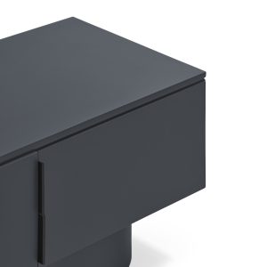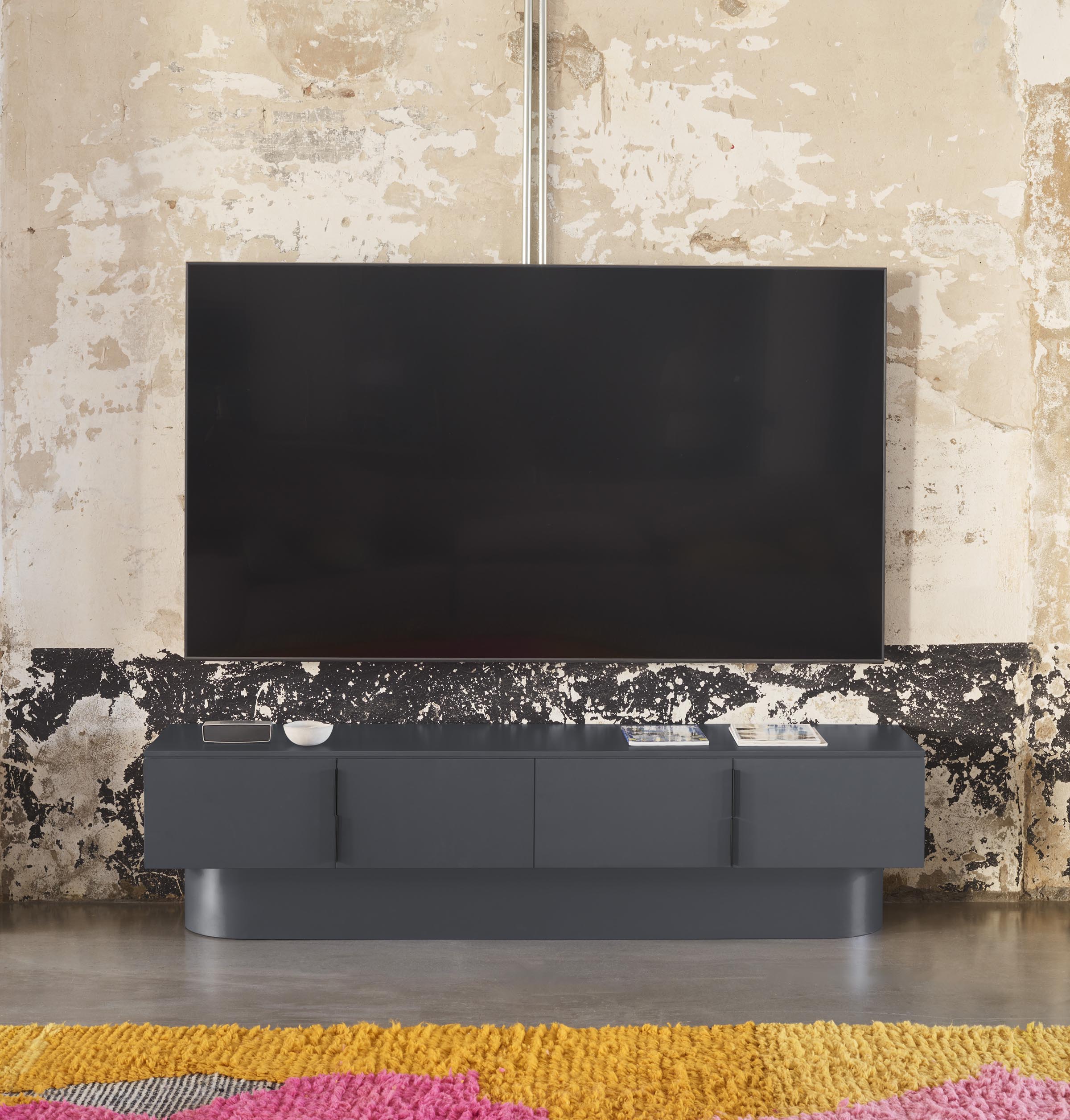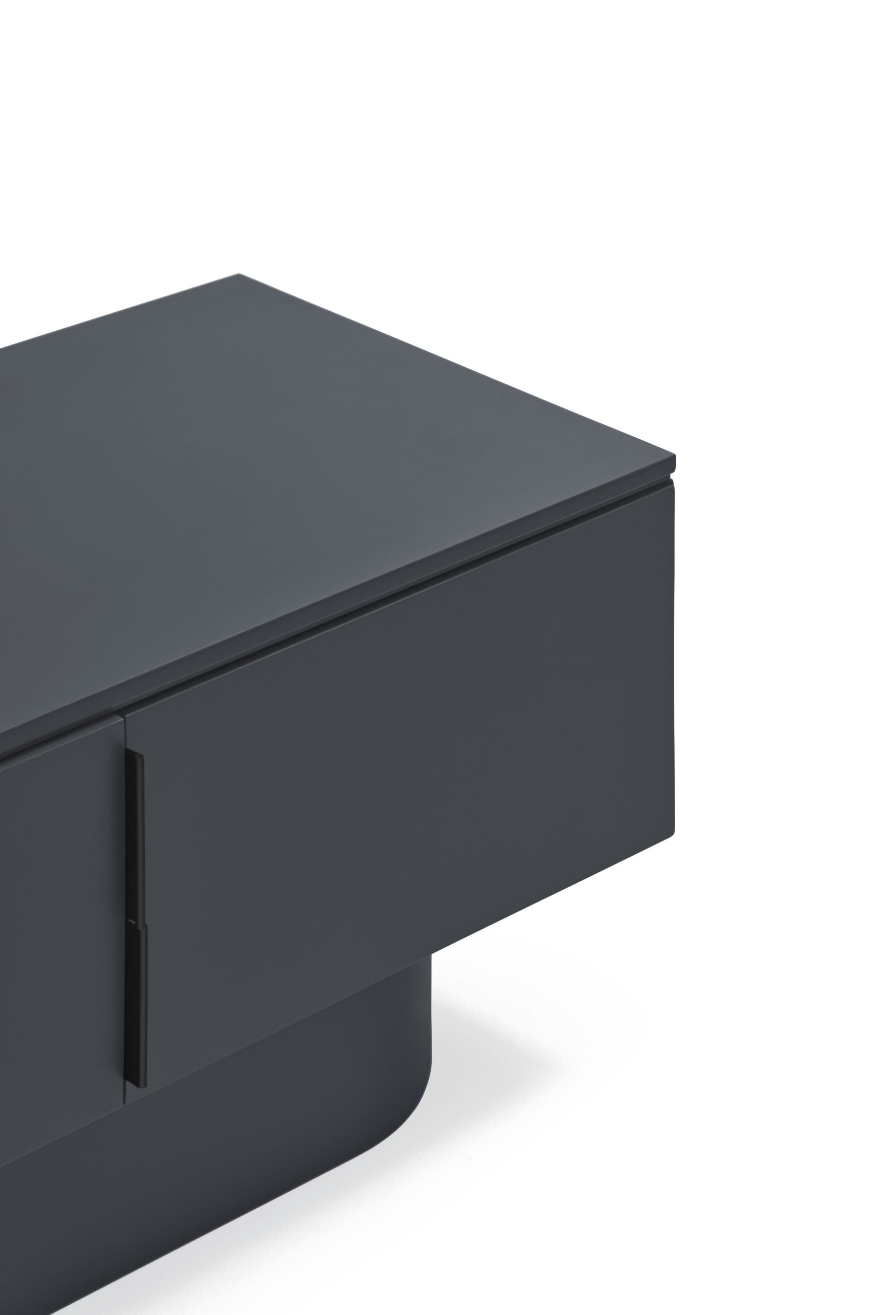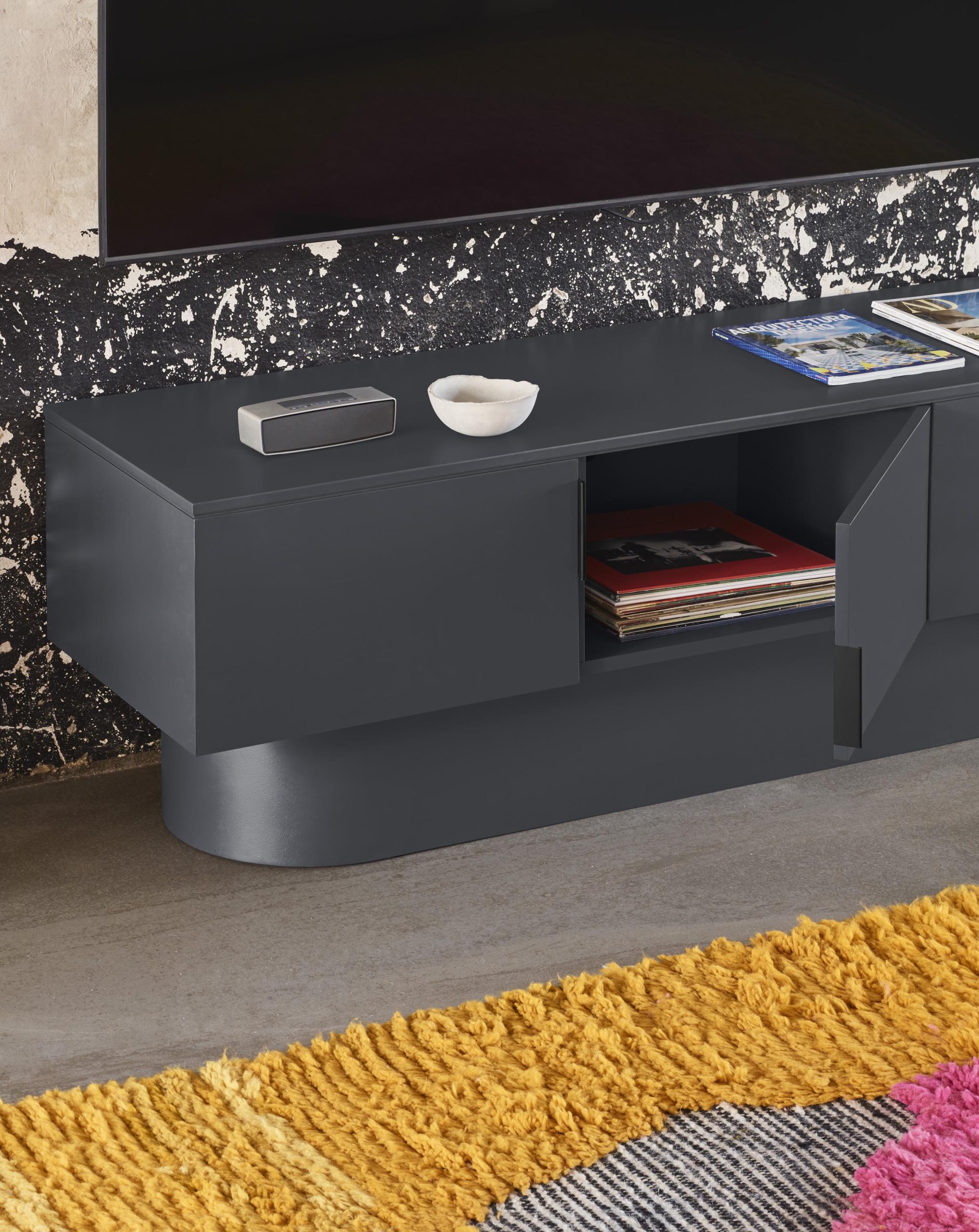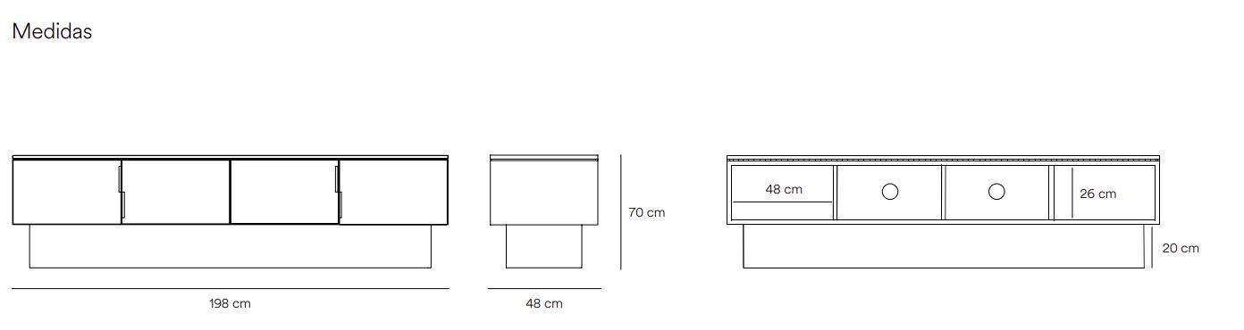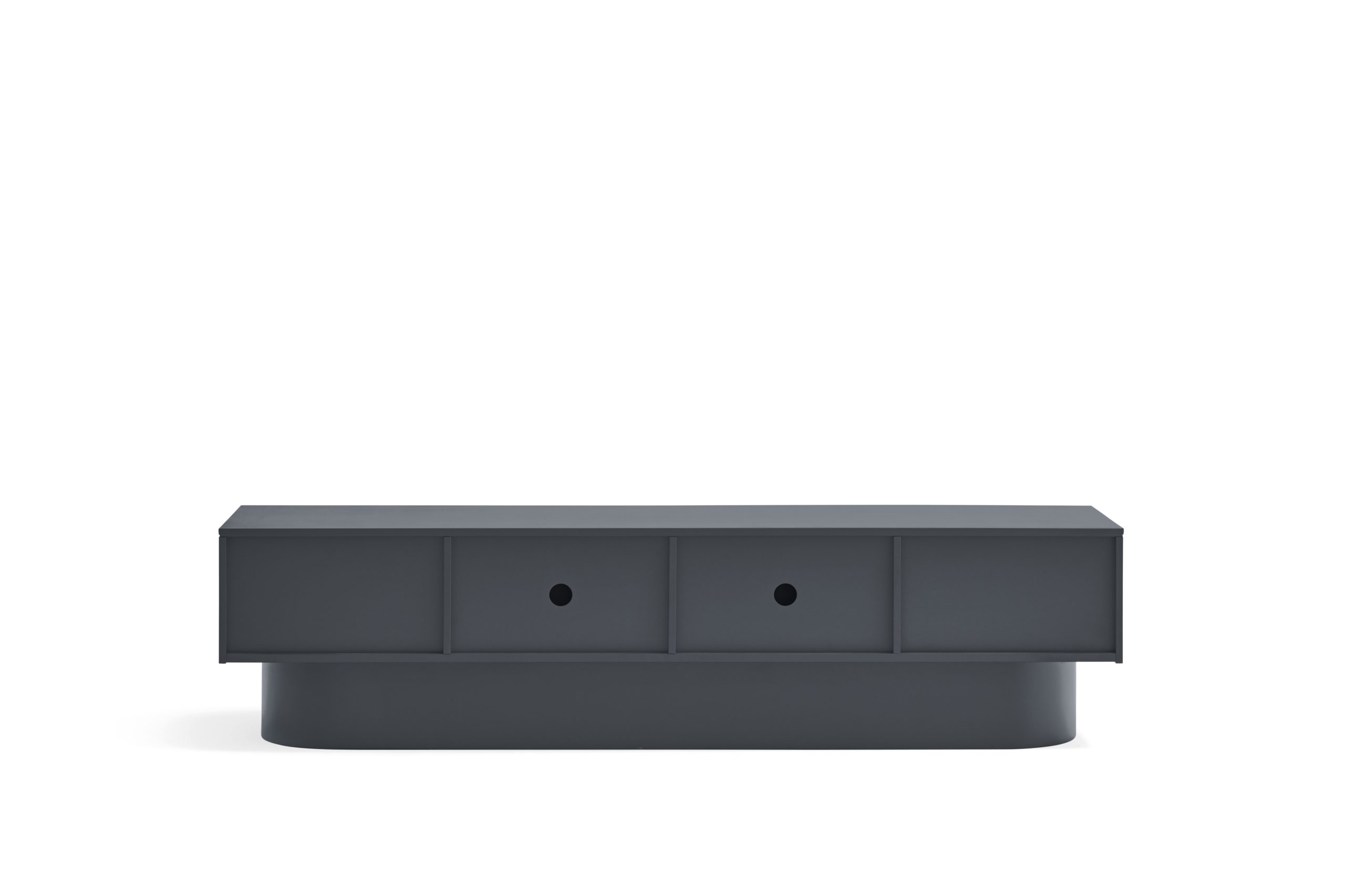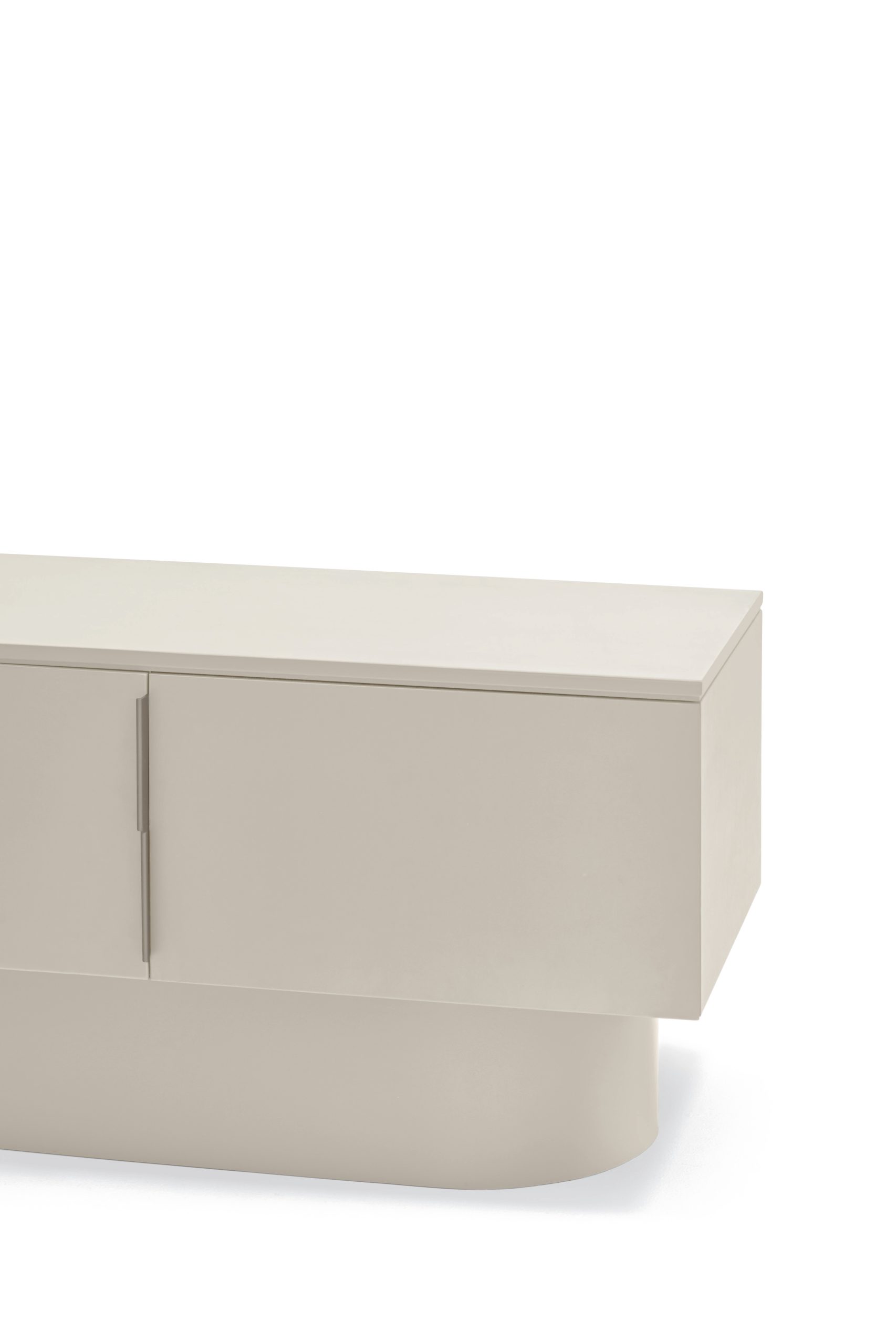 Mueble TV Tótem. Con su aspecto casi monolítico, Tótem nos invita a contemplarlo como si fuera una obra escultórica, trascendiendo los límites entre la función y la forma. Cada una de las piezas que componen el mueble encaja de manera precisa, dando lugar a un volumen limpio que reposa sobre un pedestal de formas redondeadas que forma el pie central. Además de su escultórica apariencia, se trata de una pieza funcional. Dispone de 4 puertas, donde se esconden 4 nichos y dos pasacables. Una pieza bella y versátil.