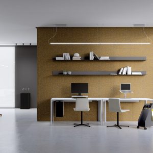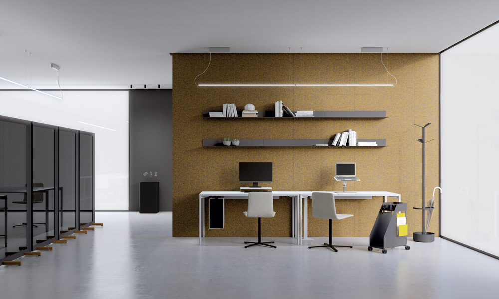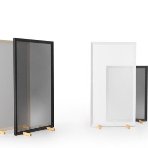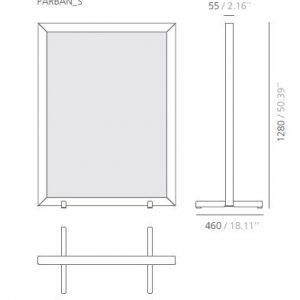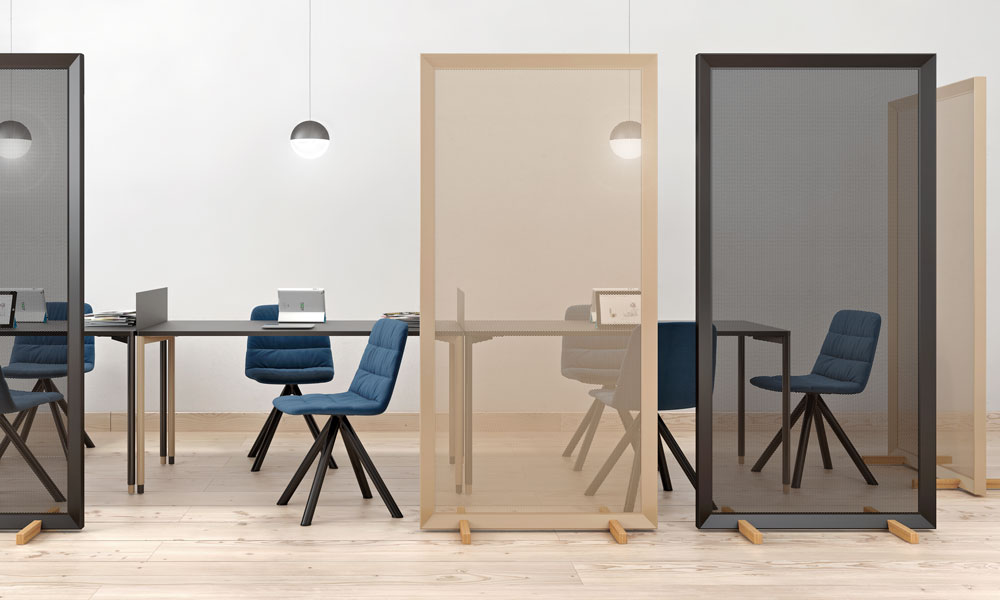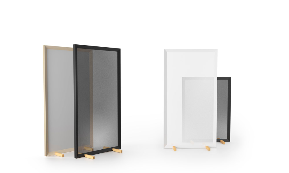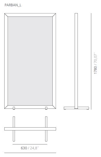 Separador de ambientes Parban. Parban es un elegante y minimalista separador de ambientes con pies de roble, compuesto por una estructura rectangular de sección triangular que enmarca una malla de aluminio.