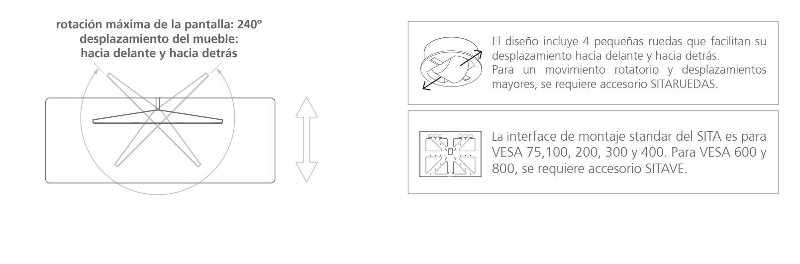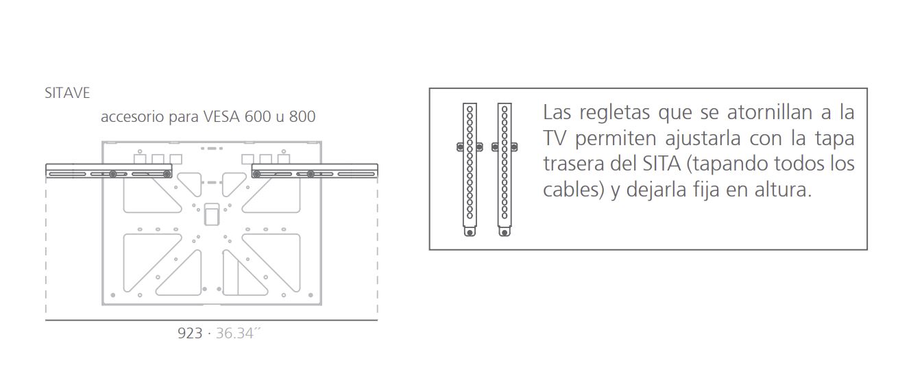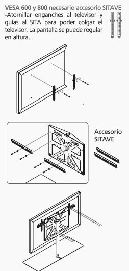 Si su televisor es VESA 600 o VESA 800 necesitará comprar el accesorio SITAVE que adapta el soporte SITA a estas dimensiones. Si su televisor cumple un VESA inferior al VESA 600, no necesita de este accesorio.
