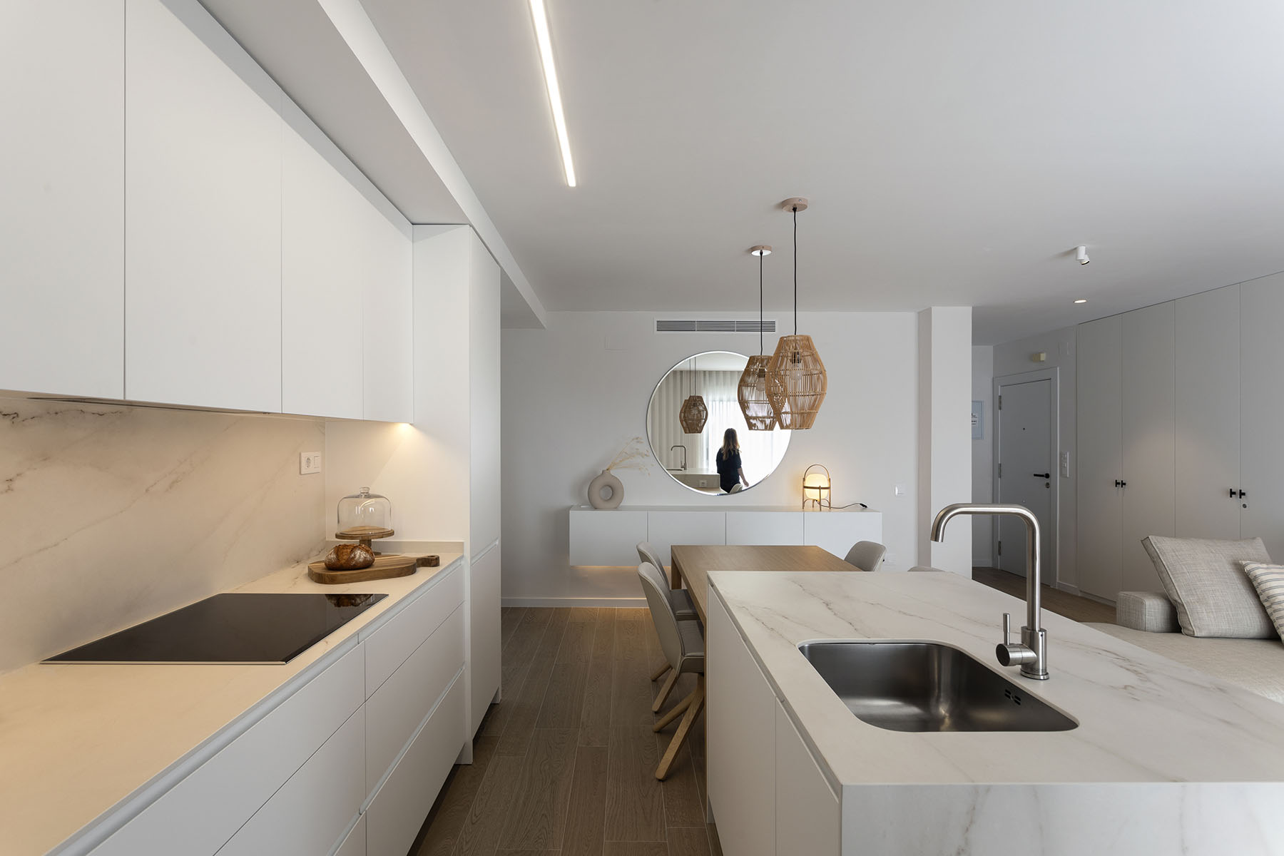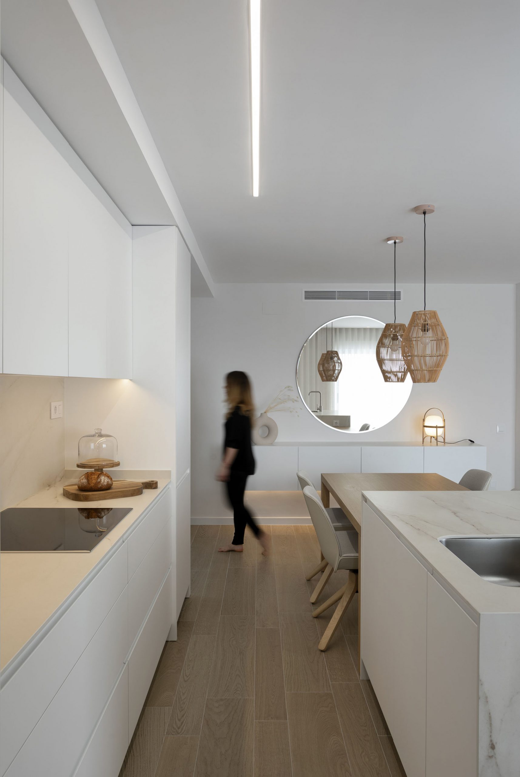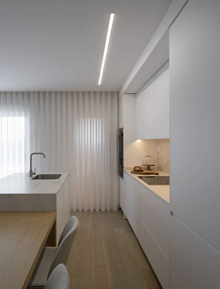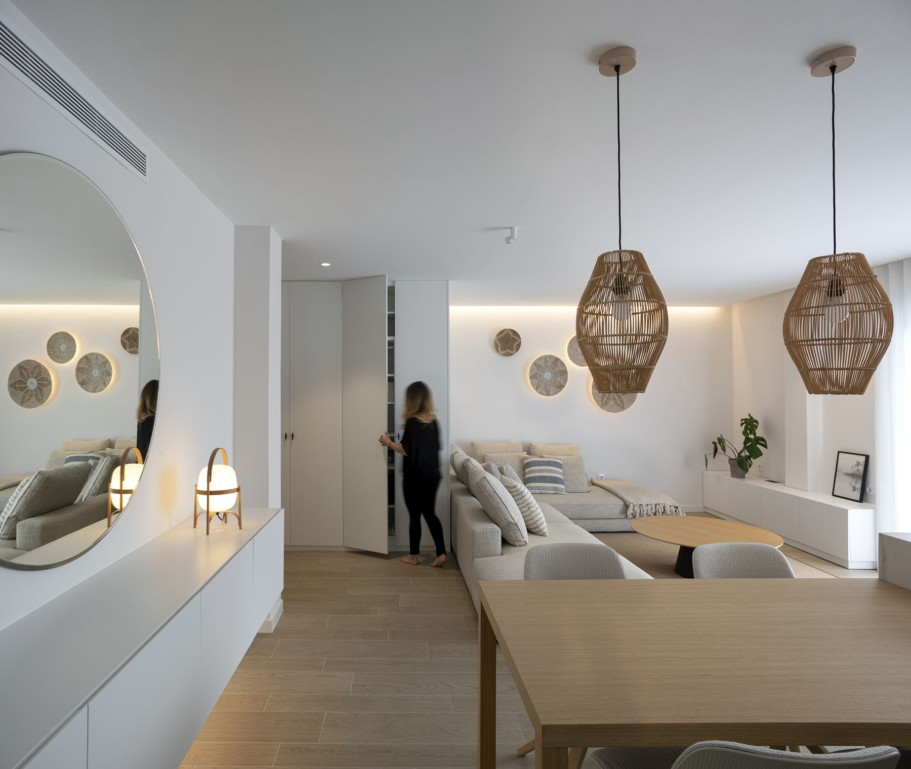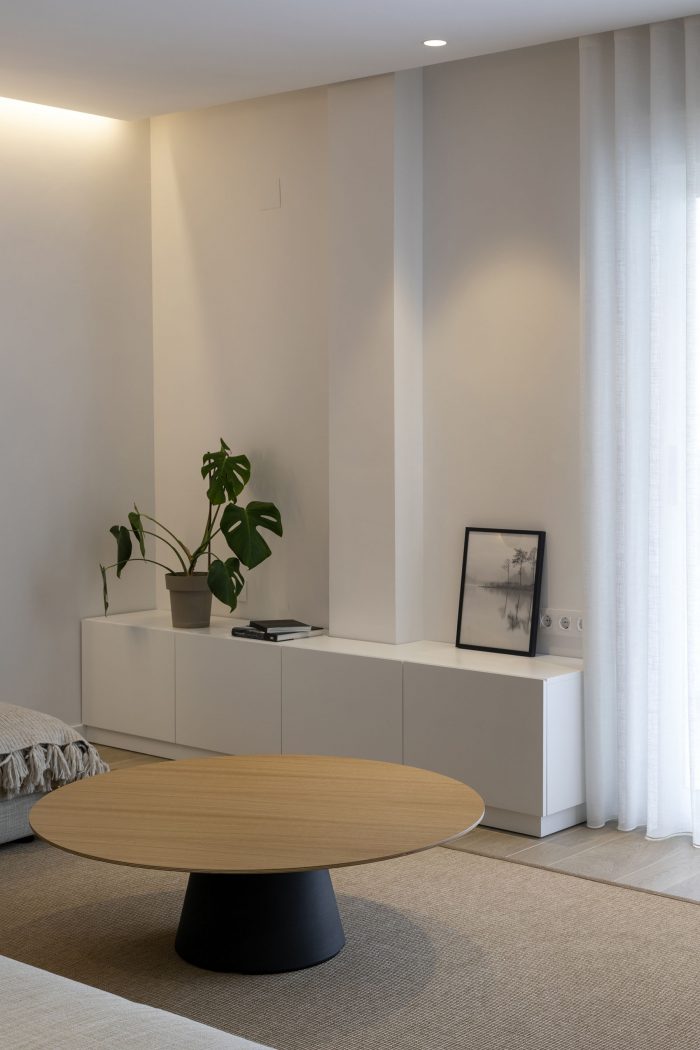 Con una intervención mínima en la tabiquería, conseguimos hacer una distribución de mobiliario que cubra todas las necesidades y conseguir un diseño fresco y ordenado con una superficie útil de tan solo 75m2.