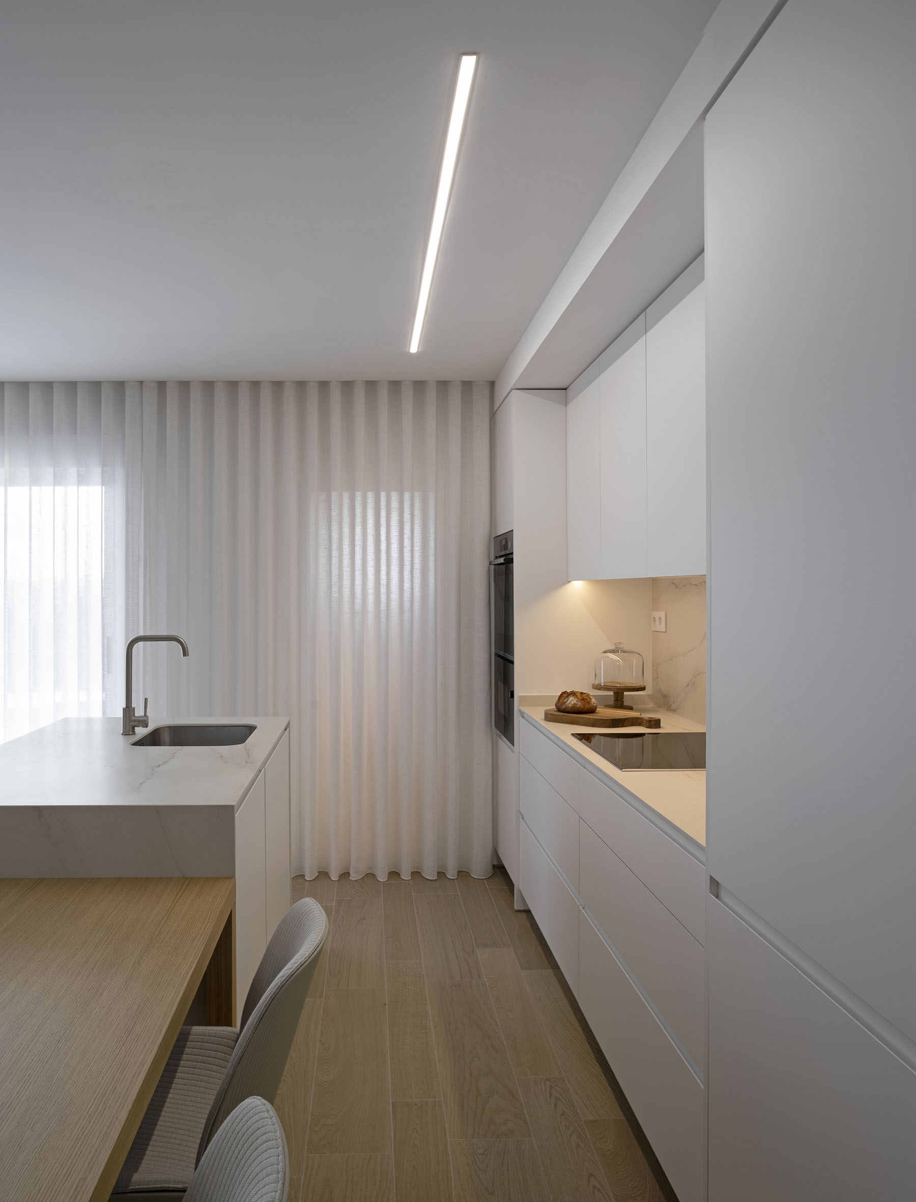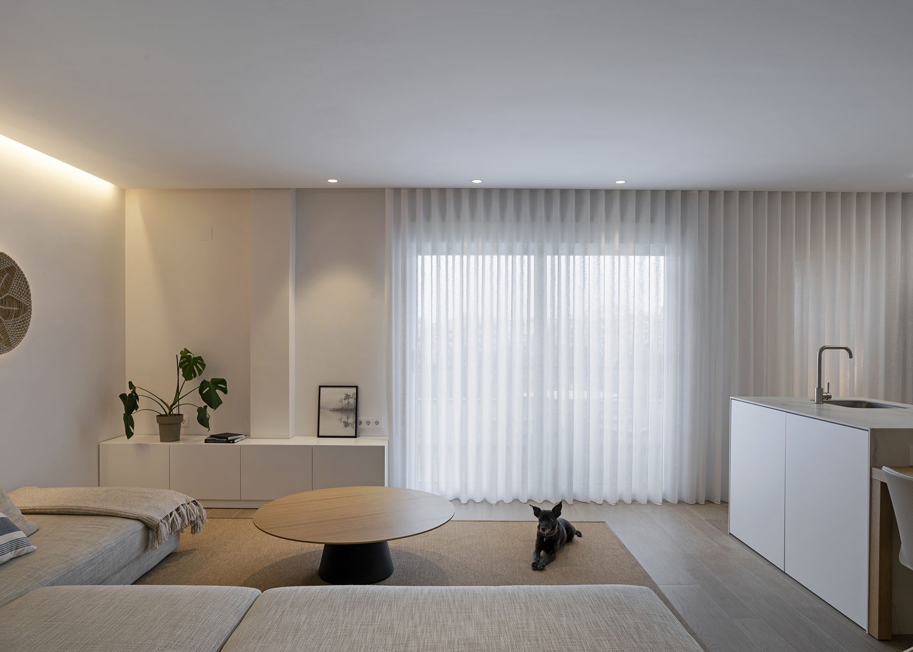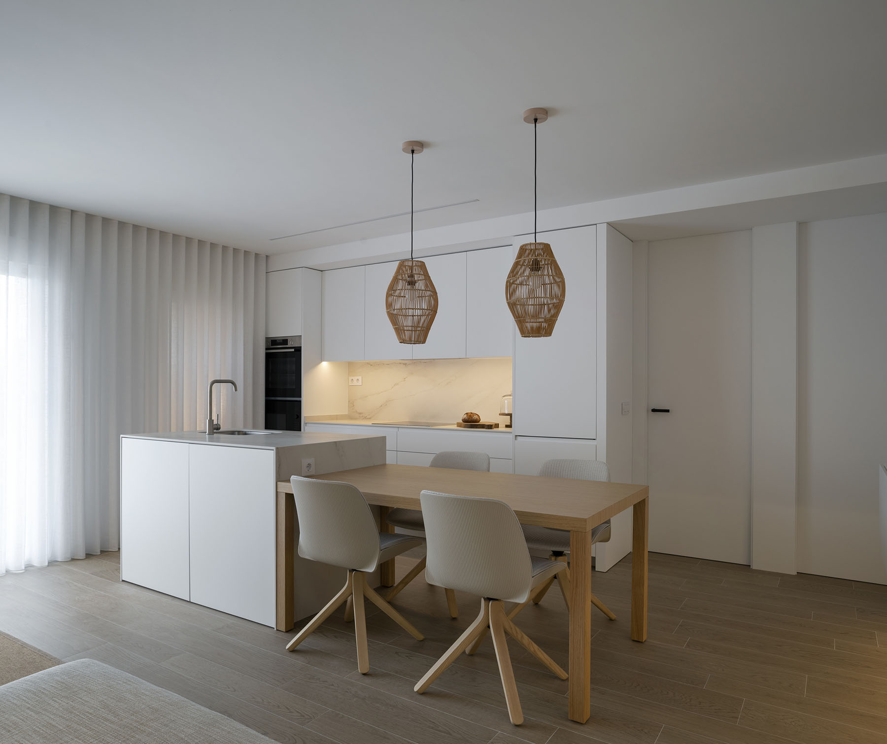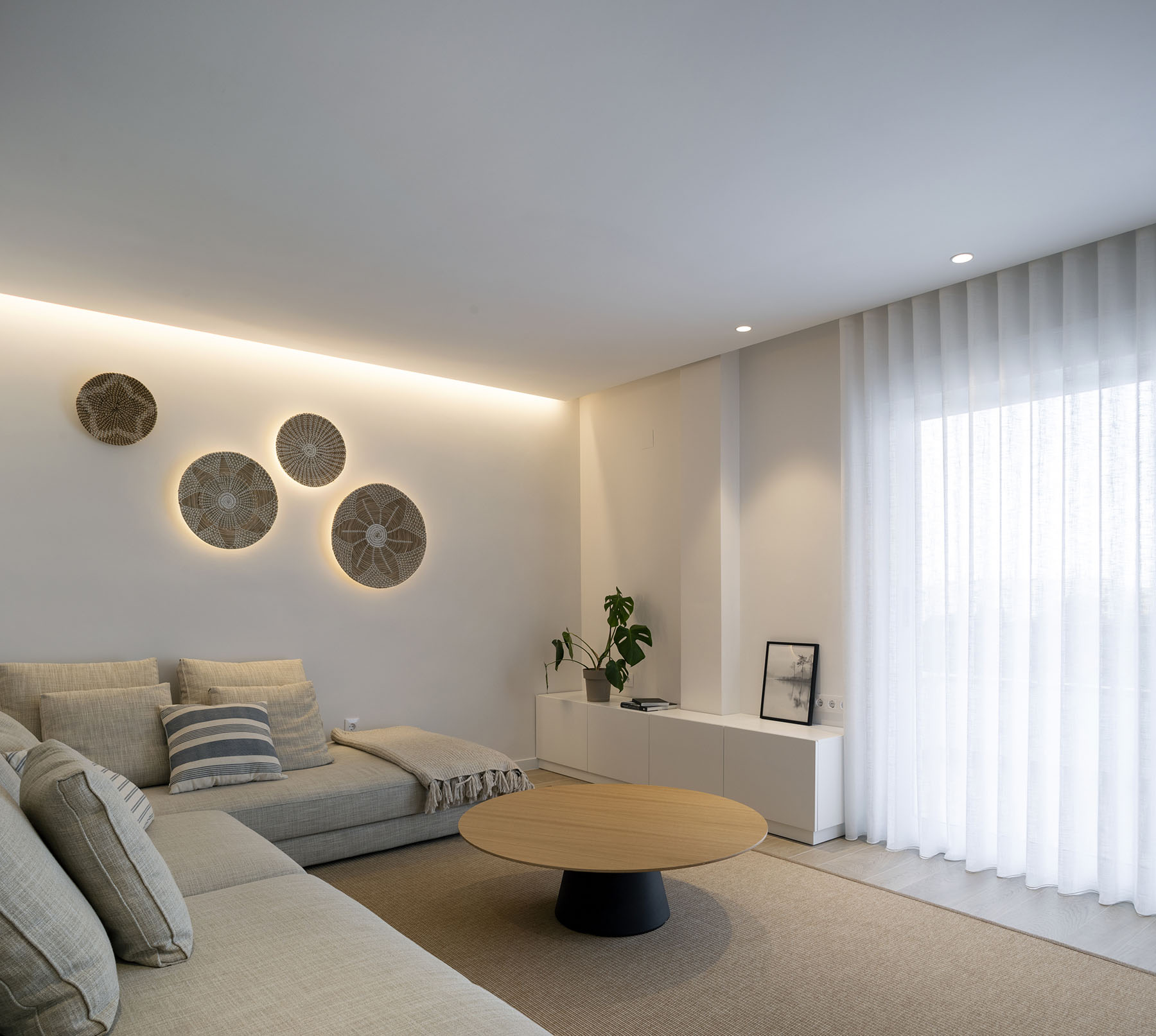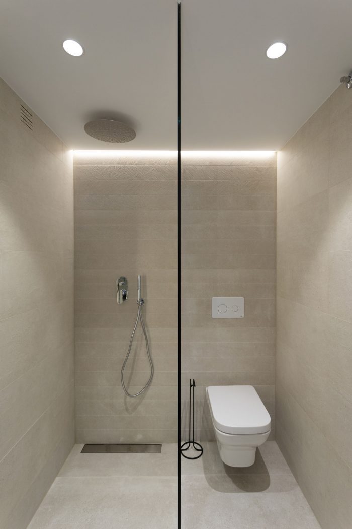 Con una intervención mínima en la tabiquería, conseguimos hacer una distribución de mobiliario que cubra todas las necesidades y conseguir un diseño fresco y ordenado con una superficie útil de tan solo 75m2.