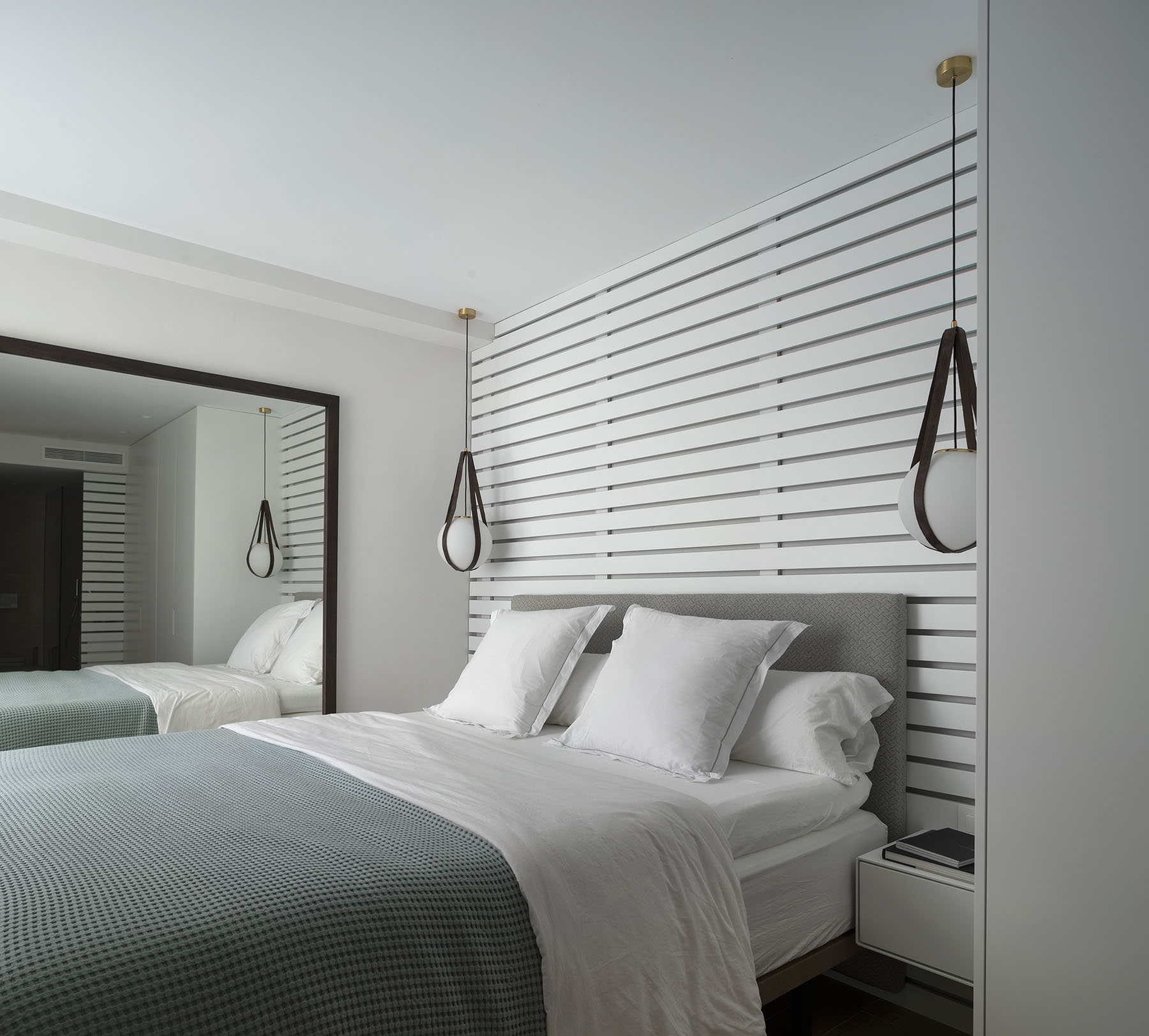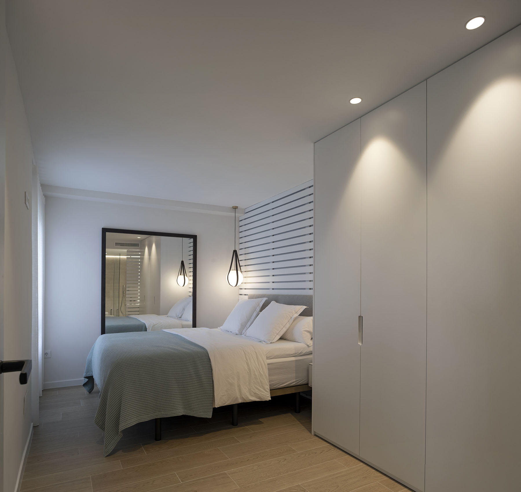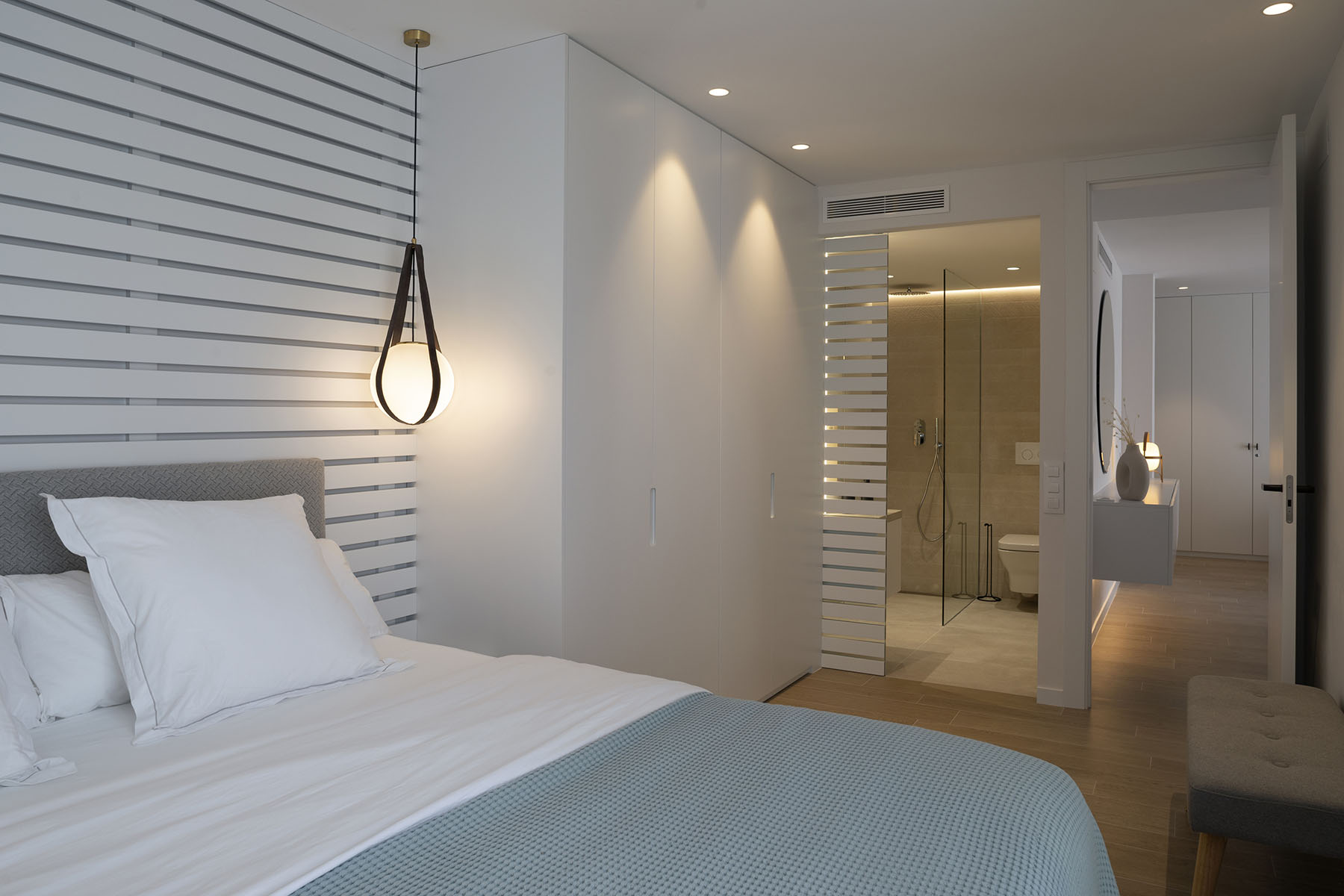 Para el cabecero se utilizaron listones de madera lacados a modo de celosía con cierto aire marino. Este mismo acabado lacado es utilizado para el armario y la sutil mesita de noche fabricada también a medida.