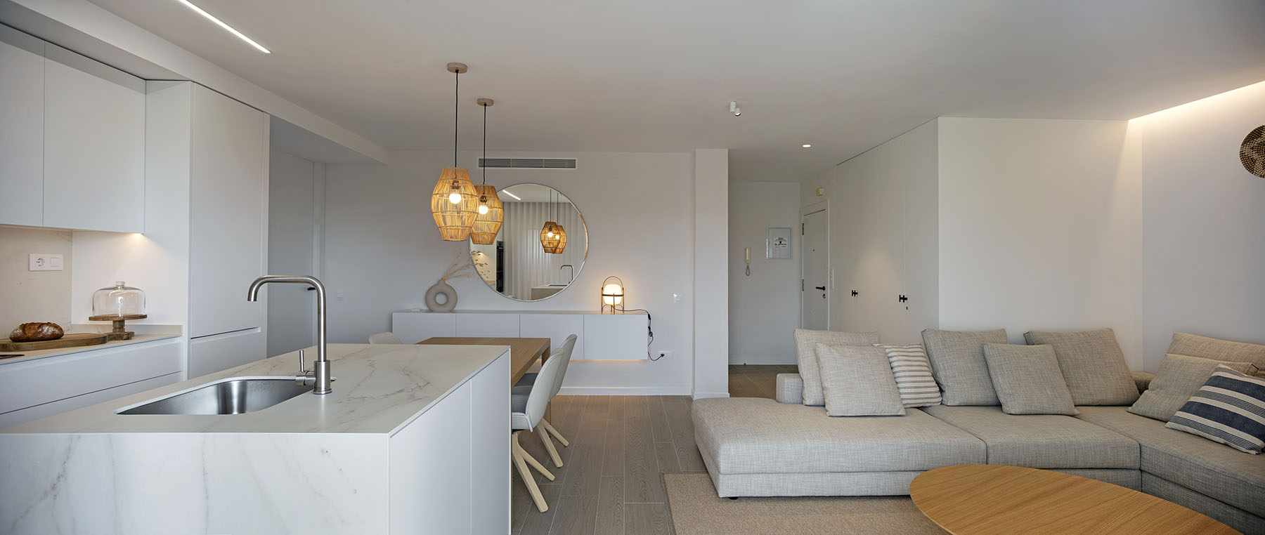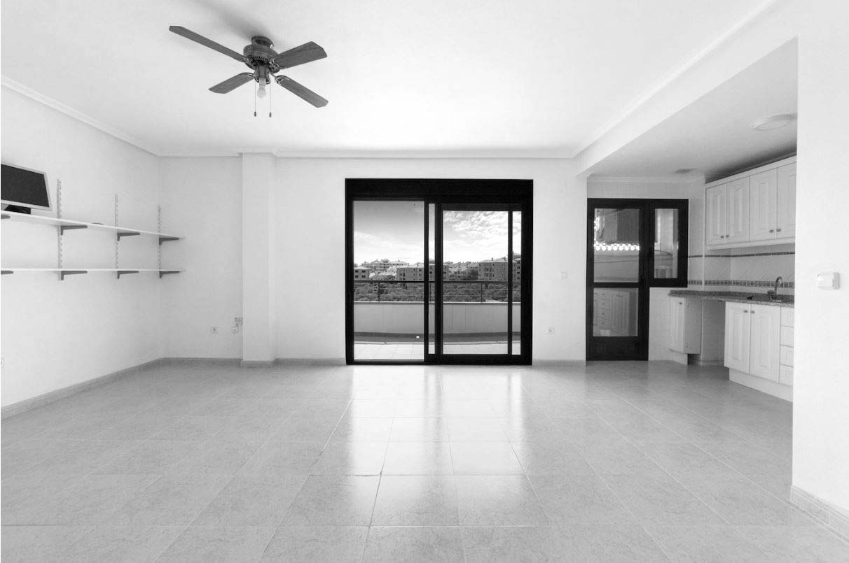 En esta ocasión nos enfrentamos al proyecto de interiorismo de un apartamento cerca de la playa de Campoamor (Alicante) que en su estado original presentaba un espacio diáfano para la zona de salón, cocina, comedor.