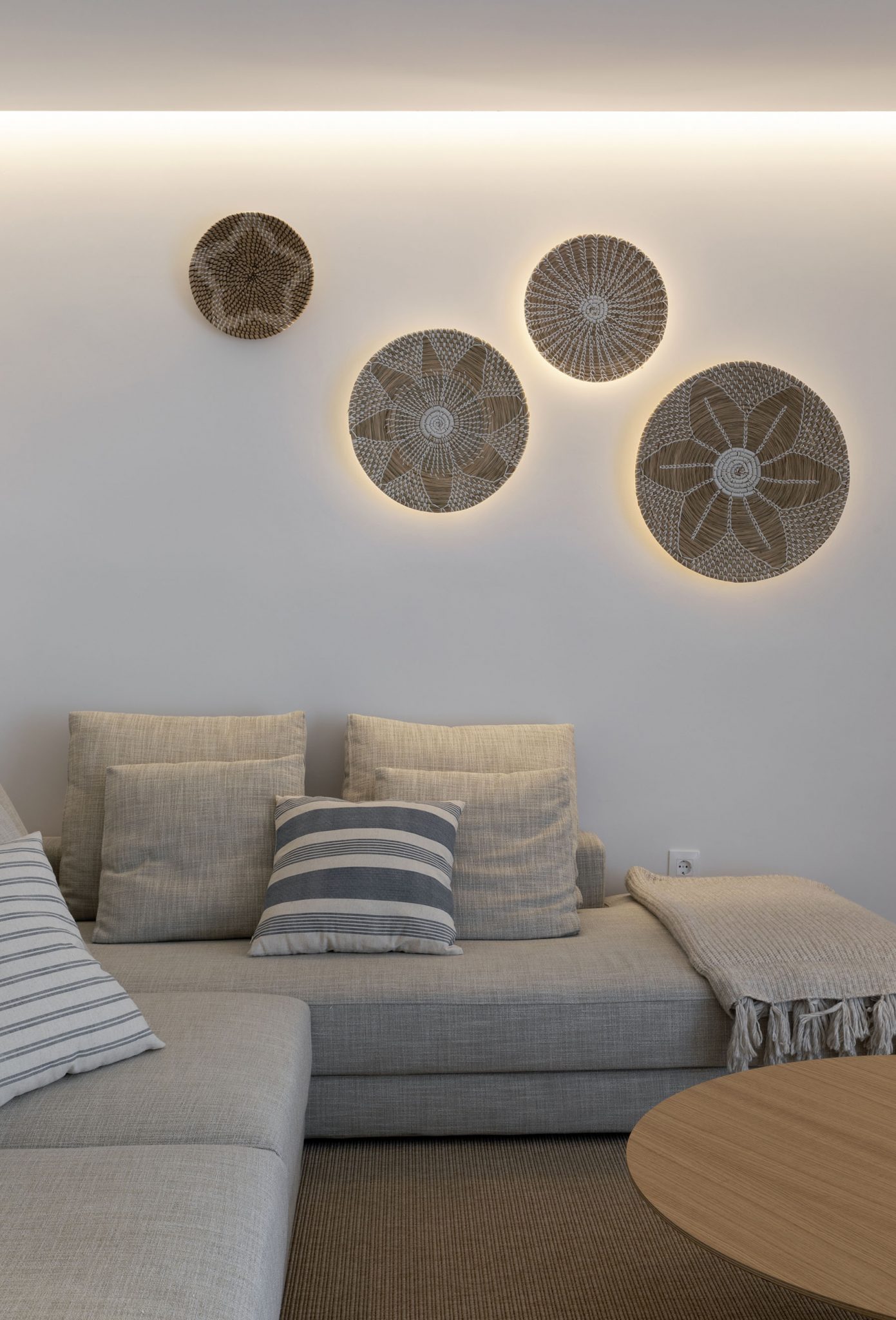 Utilizamos el uso de fibras vegetales como decoración vertical para darle mayor exotismo al ambiente combinado con otros elementos como la alfombra y las lámparas de yute. En este caso dejamos la instalación eléctrica preparada para añadirle iluminación led que mediante un regulador crea una atmosfera muy agradable.